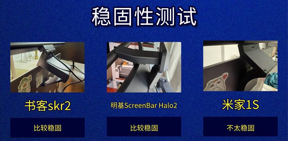 米家屏幕挂灯怎么用?在使用的过程中难免会有外力的影响,可能会导致屏幕挂灯掉落,很容易会砸坏屏幕,书客SKR2和明基ScreenBar Halo2的稳固性挺好的,经过摇晃灯具还是保持挂在电脑屏幕上,没怎么晃动。米家1S的稳定性相对来说会比另外两款差一点,摇晃后会产生灯具移位,虽然没有掉下来,但使用的时候也需要小心一点。