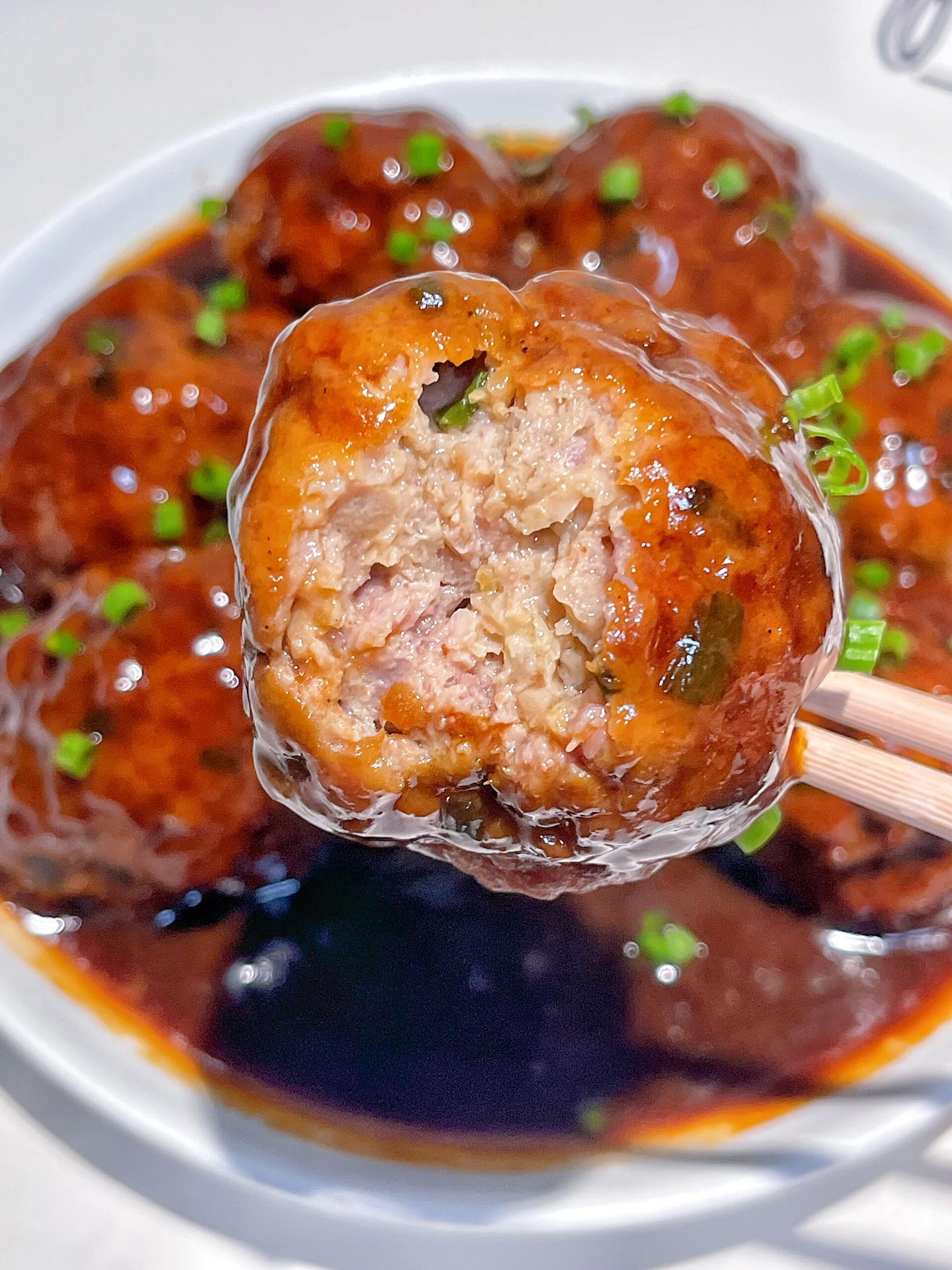 趁热夹开一个,里面的肉馅粉嫩多汁,马蹄丁清脆爽口,混合着浓郁的红烧酱汁,一口下去,满满的幸福感!配上一碗白米饭,把汤汁浇在饭上,那滋味,绝了!