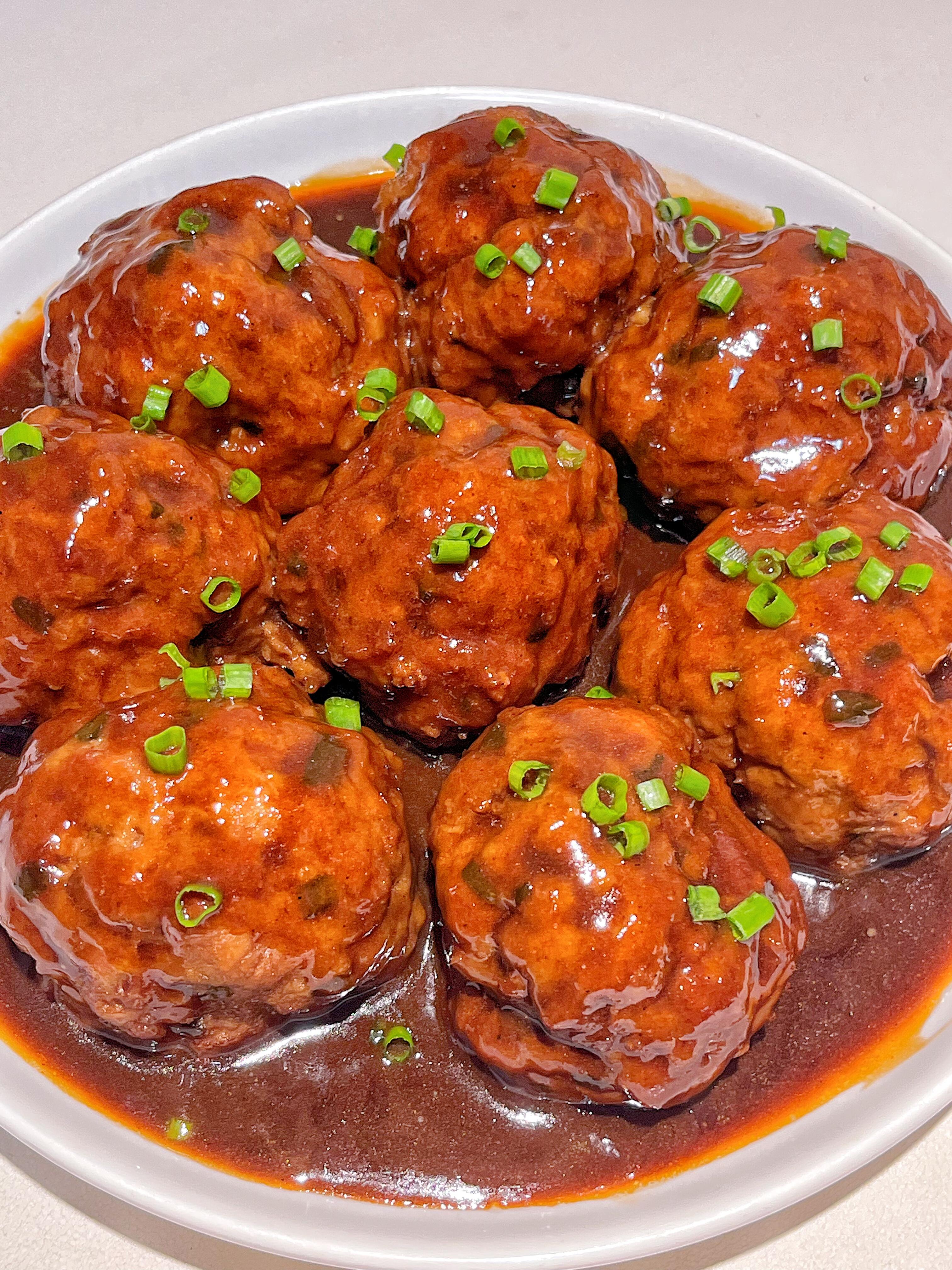 40分钟后,打开锅盖,大火收汁。汤汁变得浓稠红亮,紧紧包裹在丸子表面,这时候就可以出锅了!把狮子头小心地盛进深盘里,浇上剩余的汤汁,撒上葱花或者香菜点缀。