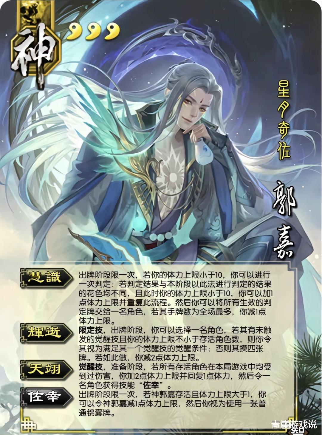 2021年国庆,迎来了一位严重冲击三国杀环境的武将,他便是时代的六万五:神郭嘉。作为一位神将,神郭嘉给足了那个时代的终极排面。凭借【慧识】、【辉逝】、【佐幸】三个顶级技能,一举,成为数值最高的武将,而且没有之一!神郭嘉的顶级数值,诞生了“奉孝不才,一轮十牌”的专属称谓。