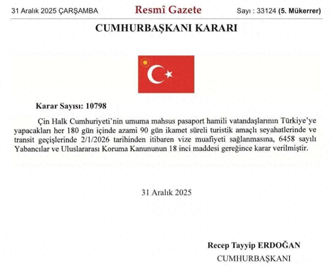 来自新华社消息,土耳其政府2025年12月31日宣布,自2026年1月2日起,对持普通护照的中华人民共和国公民实施免签入境政策。