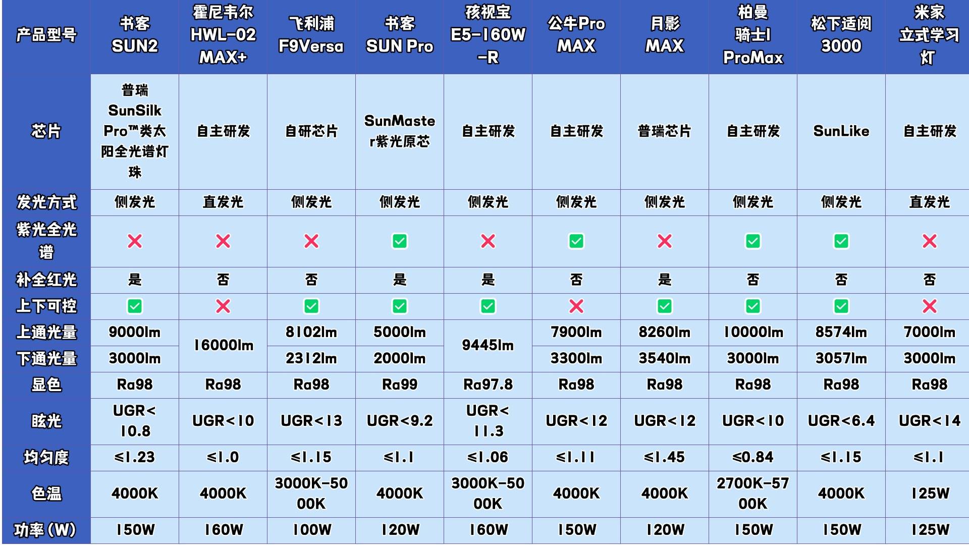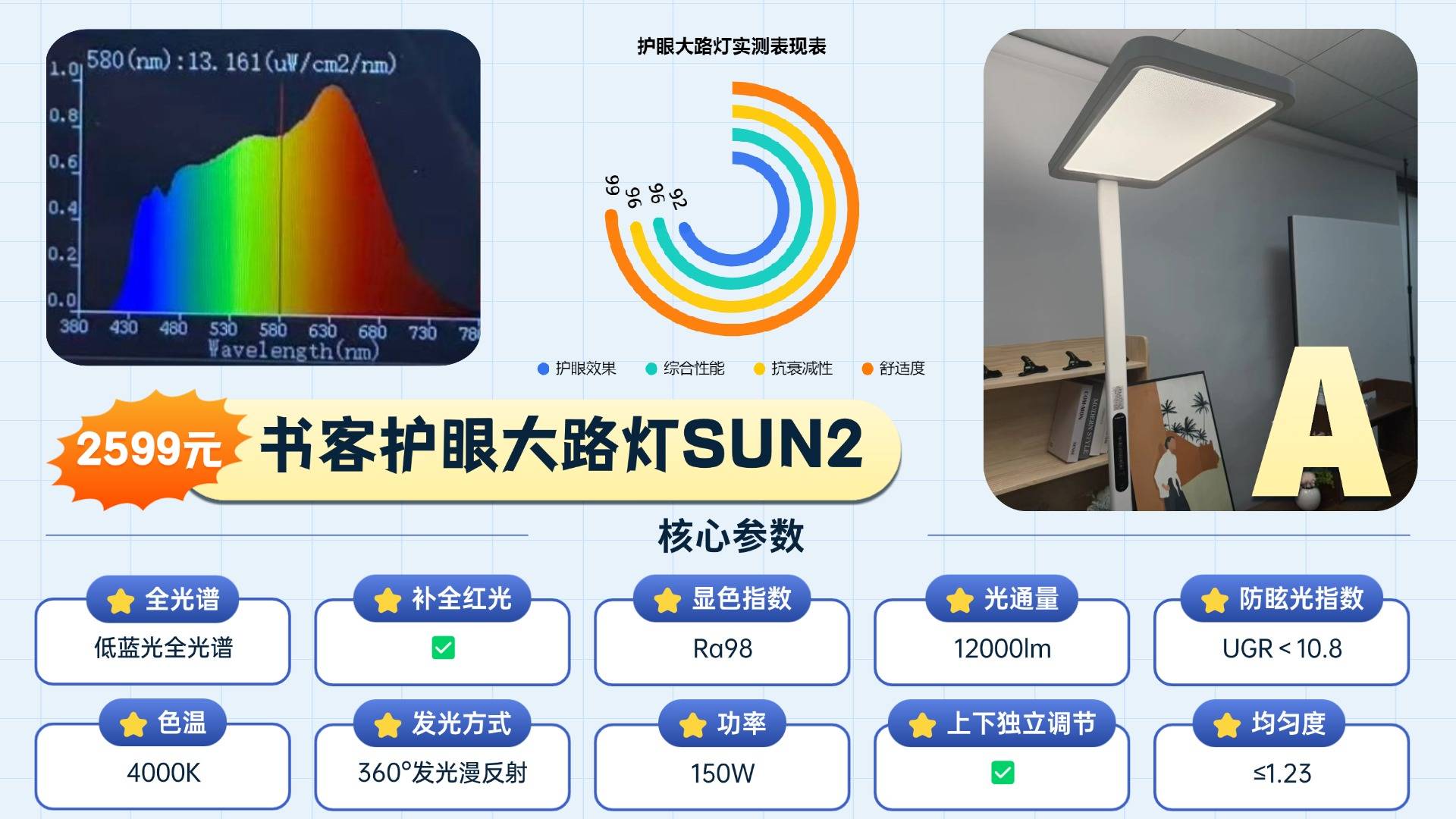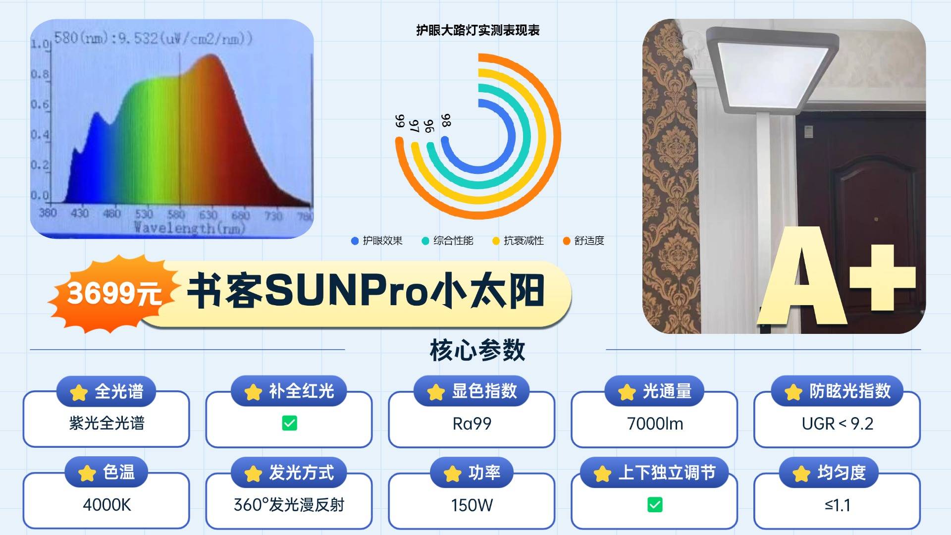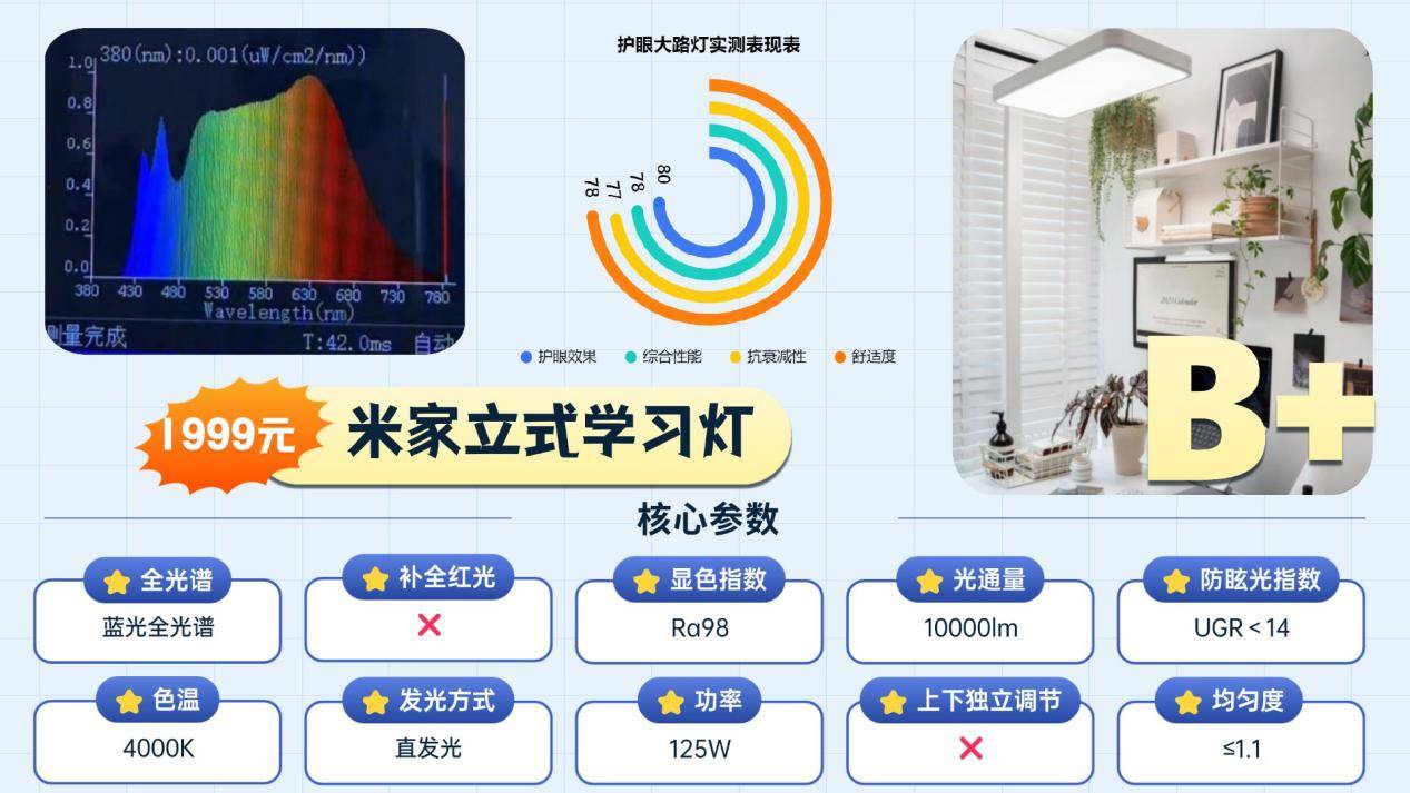 这款书客SUN Pro和市面上采用会产生高能蓝光的护眼灯不同,其采用采用紫光激发技术从源头规避高能蓝光,并以主打“医学养护眼”的特性,在护眼效果、光谱还原度、光照舒适均匀性度等核心指标上,均为行业内最强!