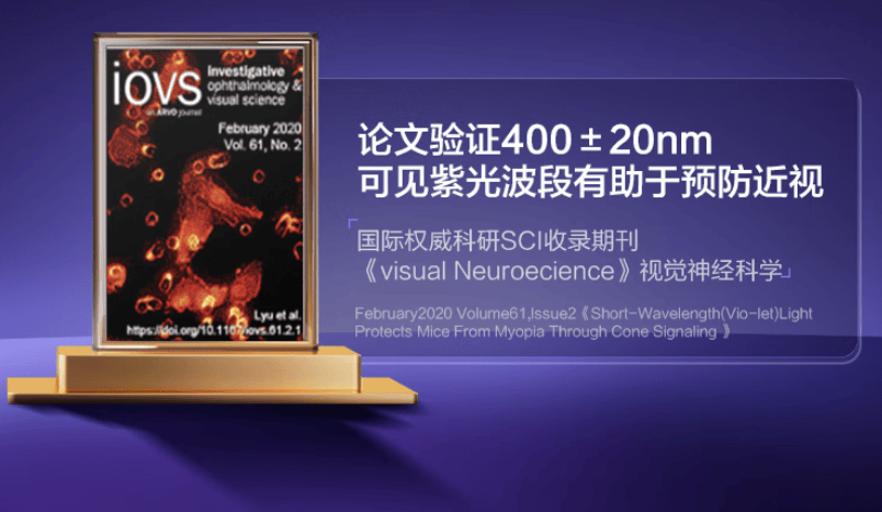 值得一提的是,国际权威科研期刊《Visual Neuroscience》(视觉神经科学) 中的研究也提到,400±20nm的可见紫光波段,对近视防控有一定积极作用,同时还能让视觉舒适度提升约4.3 倍。