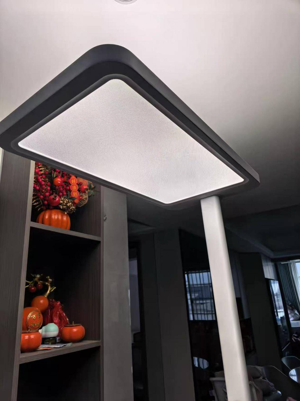 外观比较简洁大气,尤其是发光面和灯杆前伸的结构设计,矩形一体式发光面能够提供比较明亮的光线,光通量大约在10000lm左右,同时发光面还支持 90°旋转调节,功能方面,它采用无线蓝牙遥控器控制,支持左右滑动实现无极调光,不过从目前了解到的信息来看,它在光学技术和光线优化方面的投入相对不算多,配置以及护眼性能上都有待提升,只适合日常提升亮度的考虑。