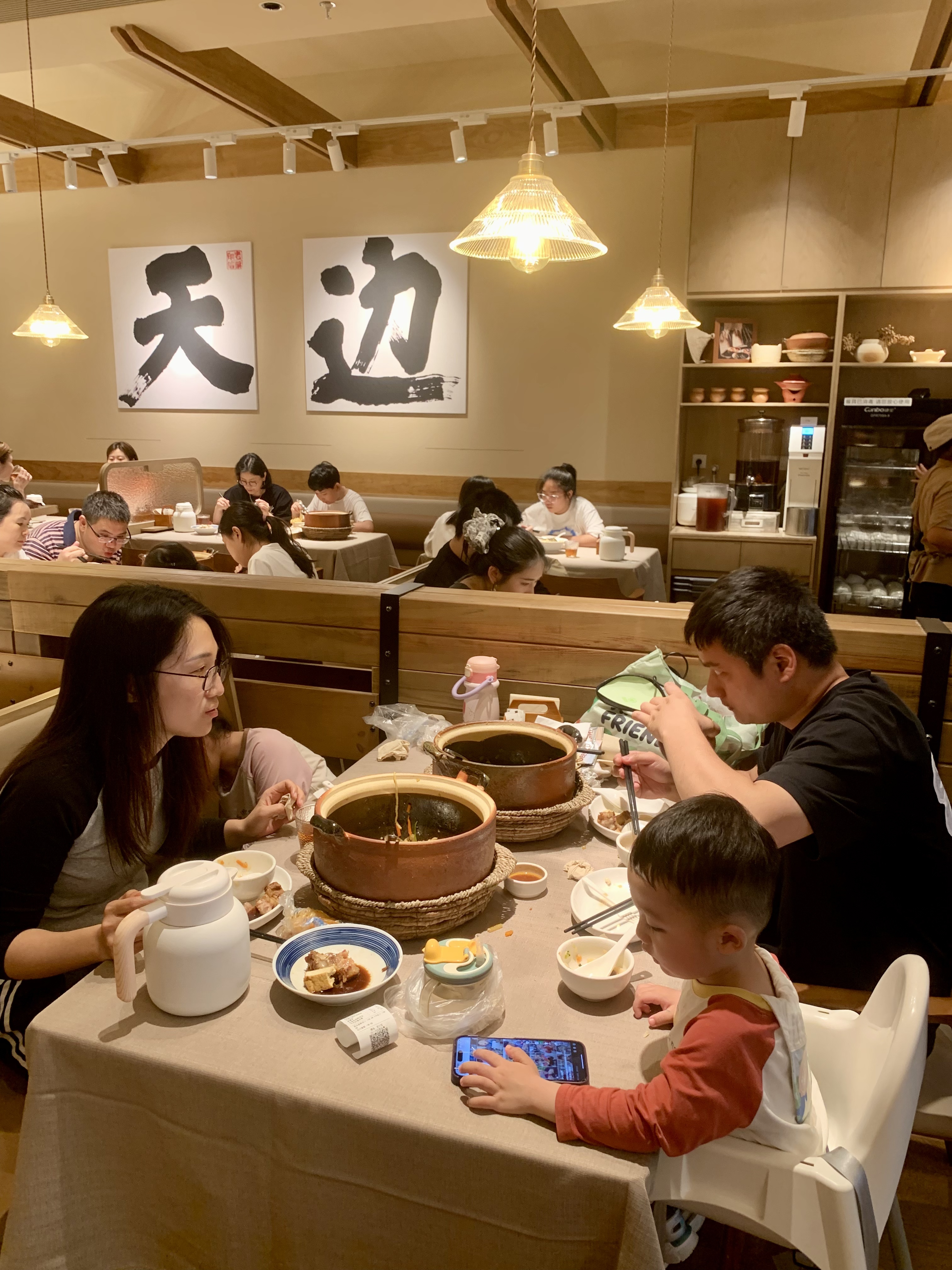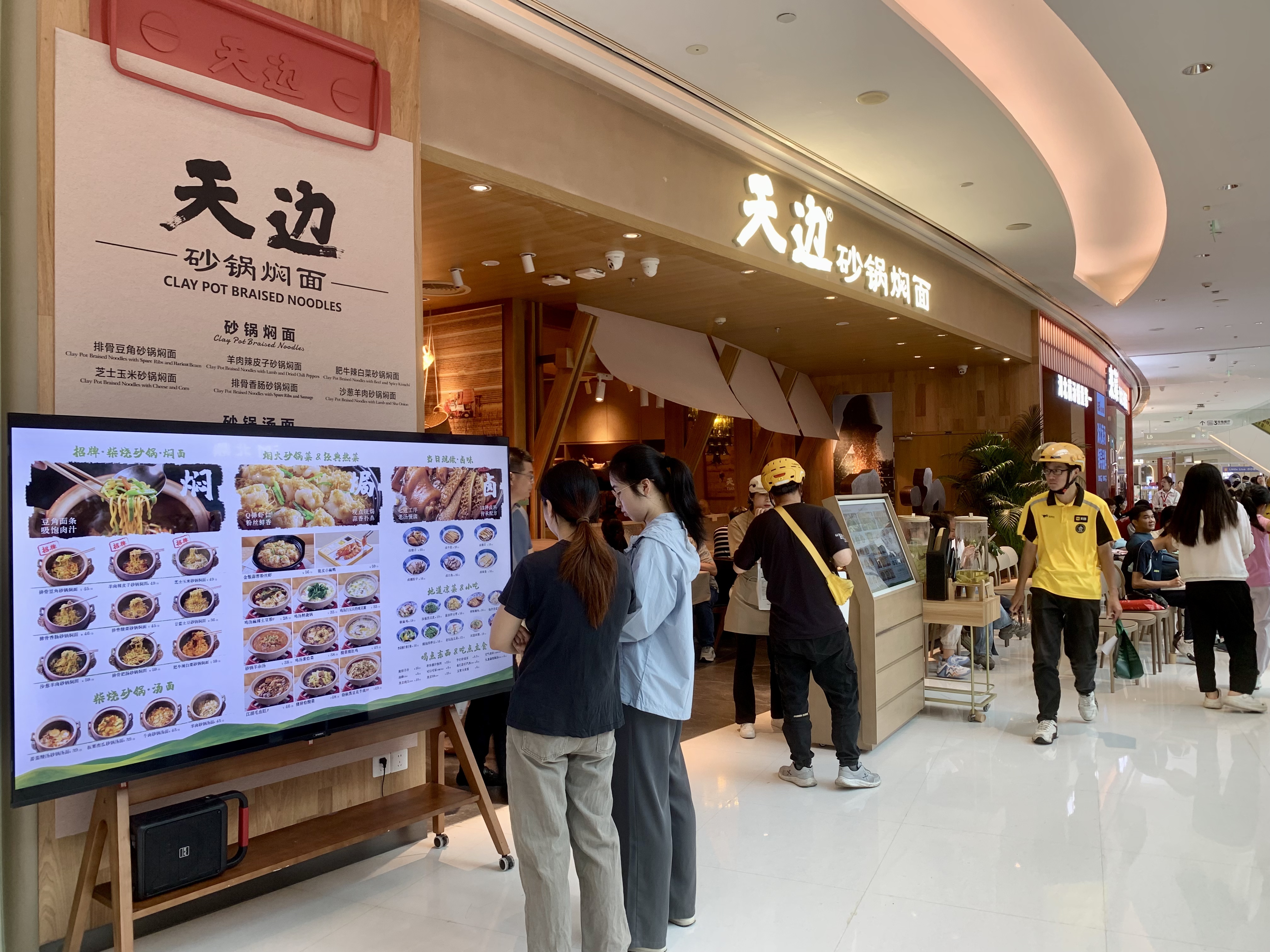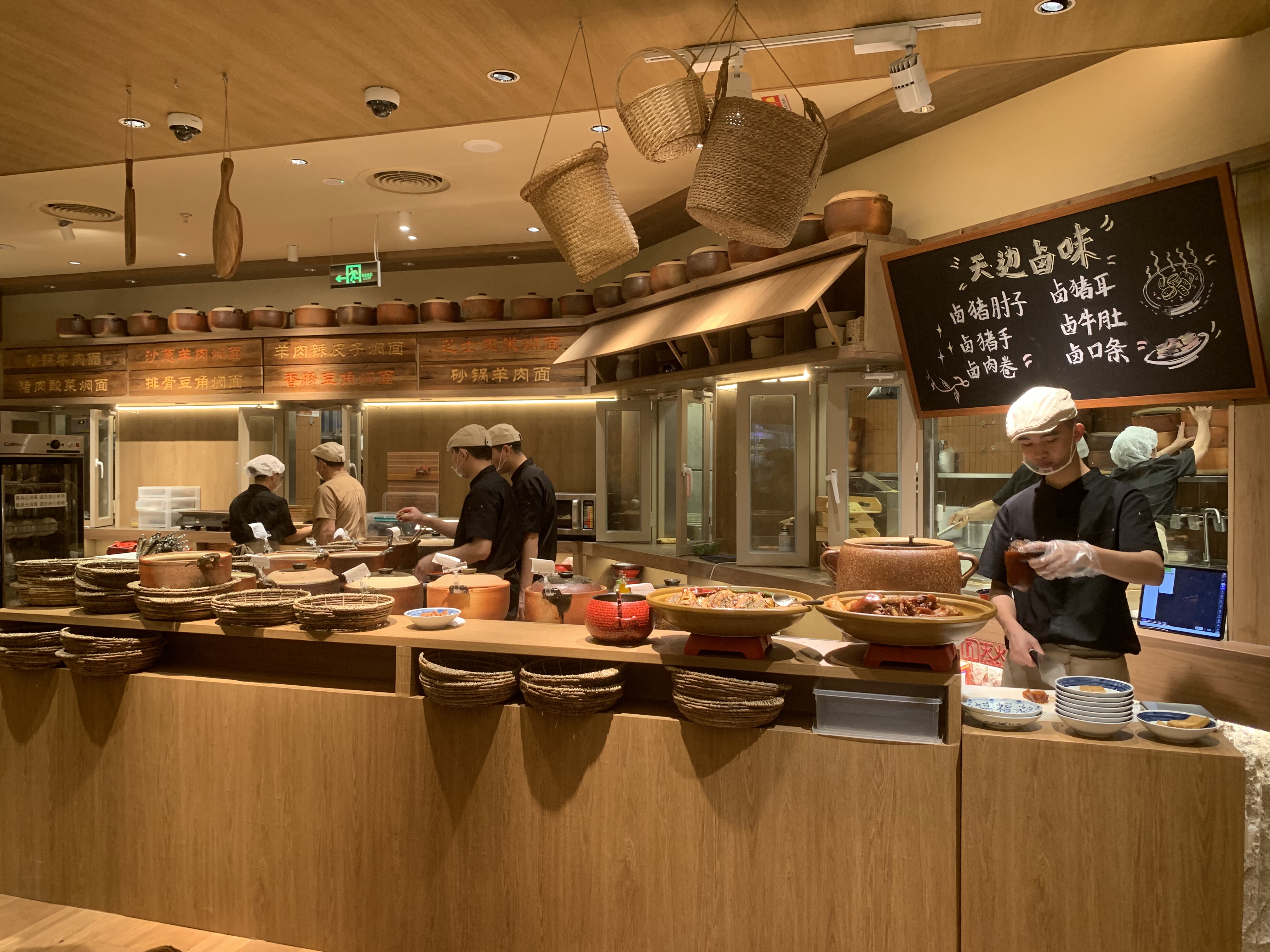4月6日中午将近1点,记者来到位于深圳福田卓悦汇五楼的天边砂锅焖面,看到门口还有少部分人在排队。可以看得出该店是崭新的店面,装修得比较别致和古朴,很有民族风情。店内空间不大不小,厨房区域是明厨亮灶,用餐高峰期人气比较高。