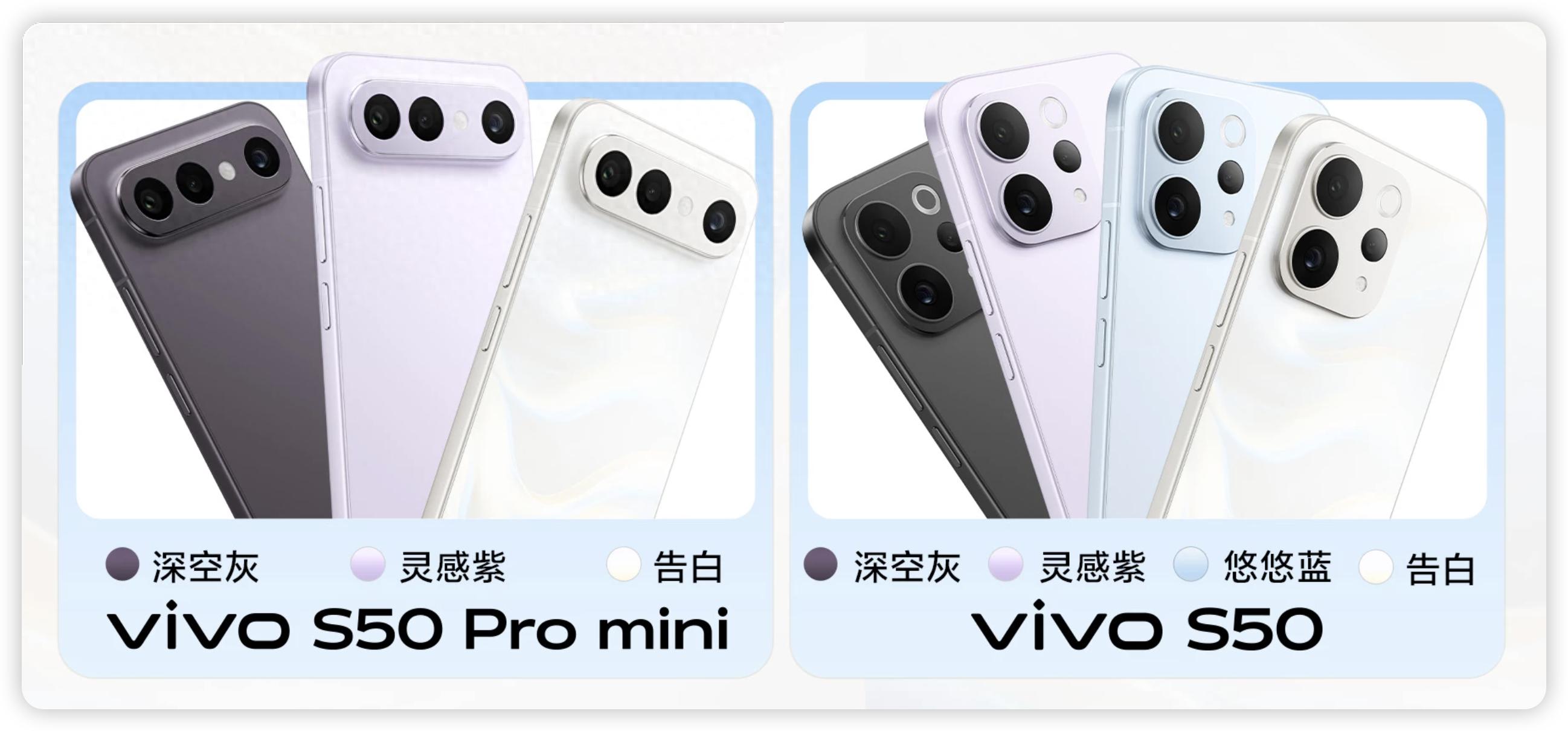 其中vivo S50 Pro mini的影像模组有种iPhone Air的感觉,因为它也采用了横向长条环形模组的设计,vivo S50则采用更加常见的左侧圆角矩形影像模组的设计,对于这两个设计,不知道大家觉得哪个设计更加好看。