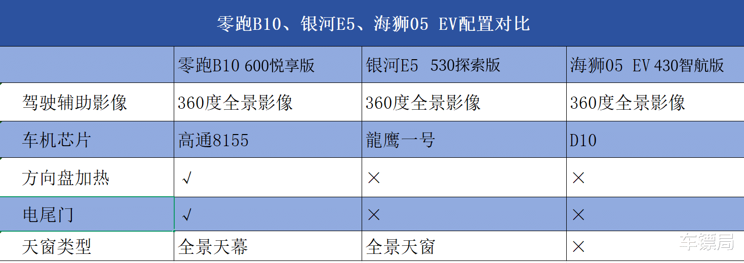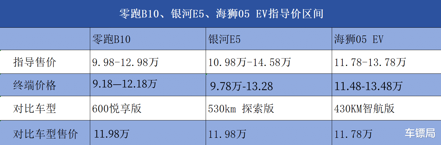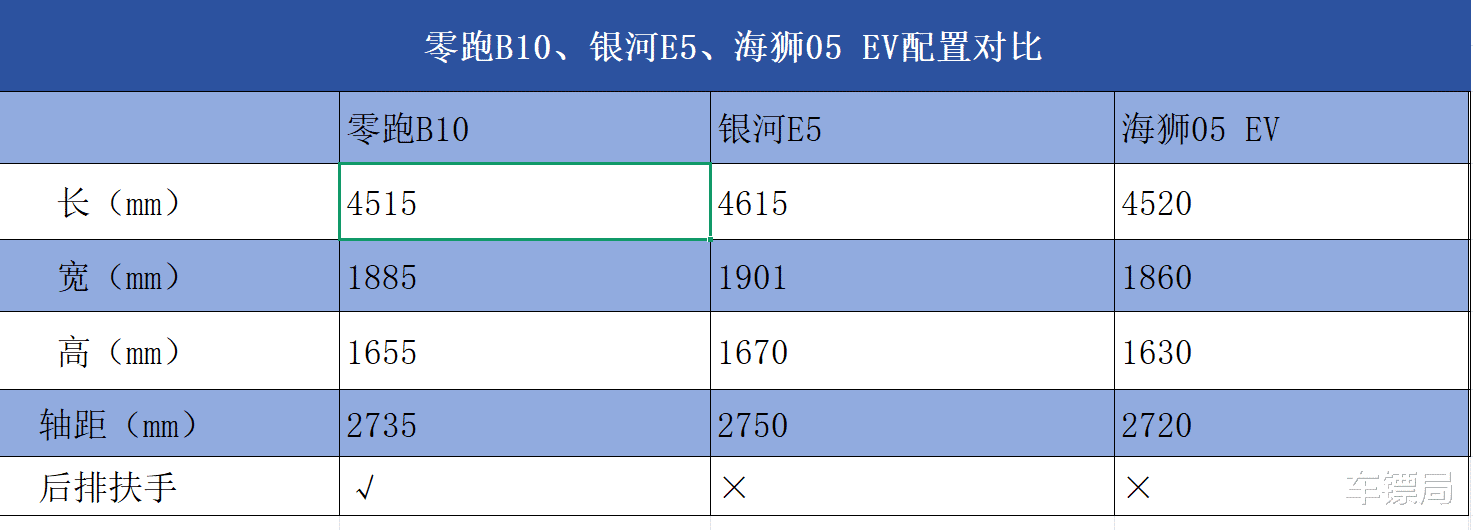很明显,即便三者都有一定的优惠,零跑B10的整体售价也会偏低一些,银河E5处于中间水平,而海狮05 EV是三者中价格最高的。为了更加直观,我们就拿价格比较接近的三款车型进行对比,它们分别是零跑B10 600悦享版、银河E5 530km 探索版、海狮05 EV 430KM智航版。