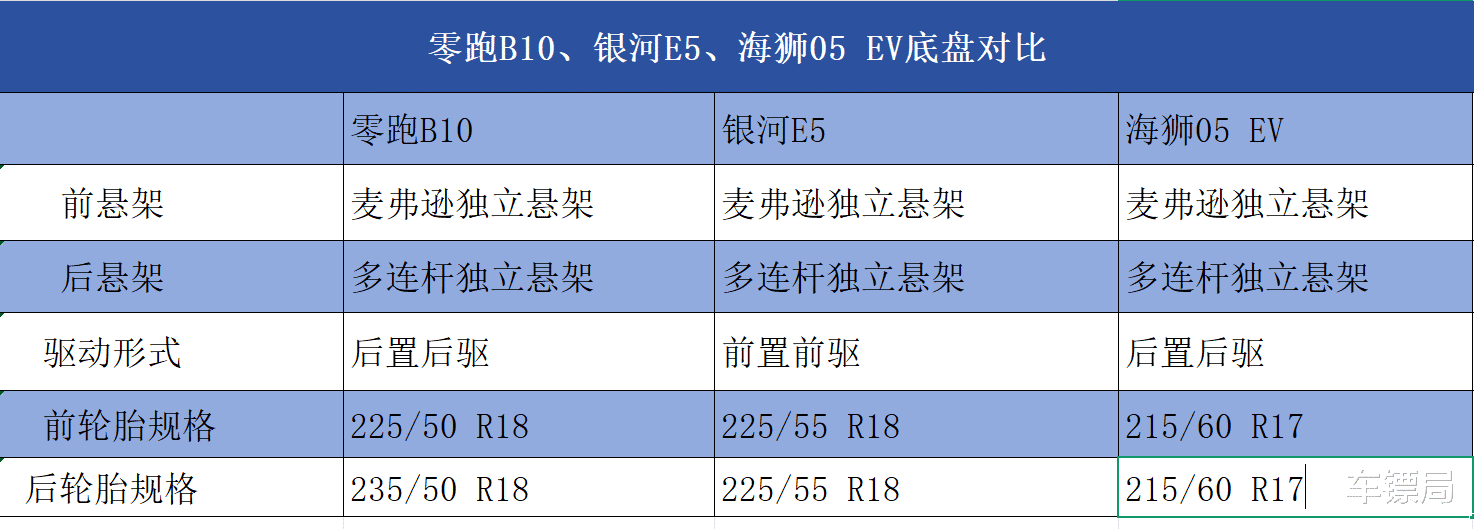 除了悬架和驱动形式,影响驾驶质感的还有轮胎。零跑B10的轮胎规格为前225、后235,银河E5前225、后225,海狮05 EV前215、后215。很明显零跑B10的胎宽略占优势,再搭配上后驱的形式,高速转弯的稳定性和操控性都能兼顾的更好一些。