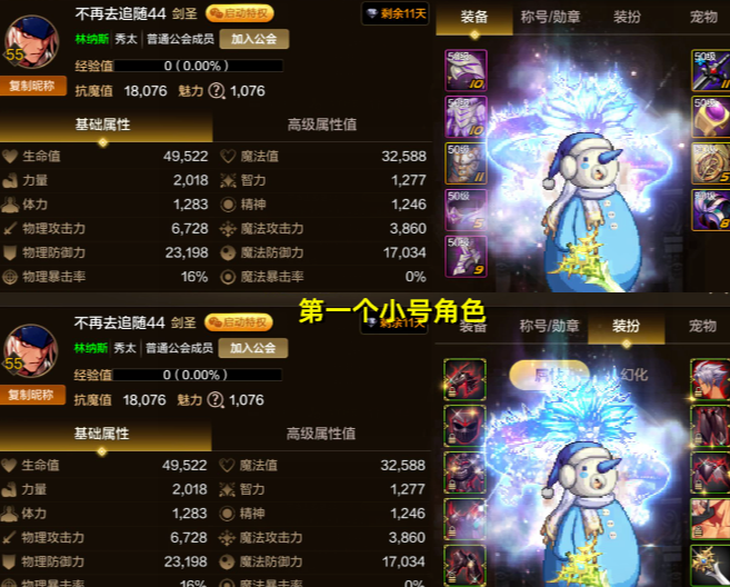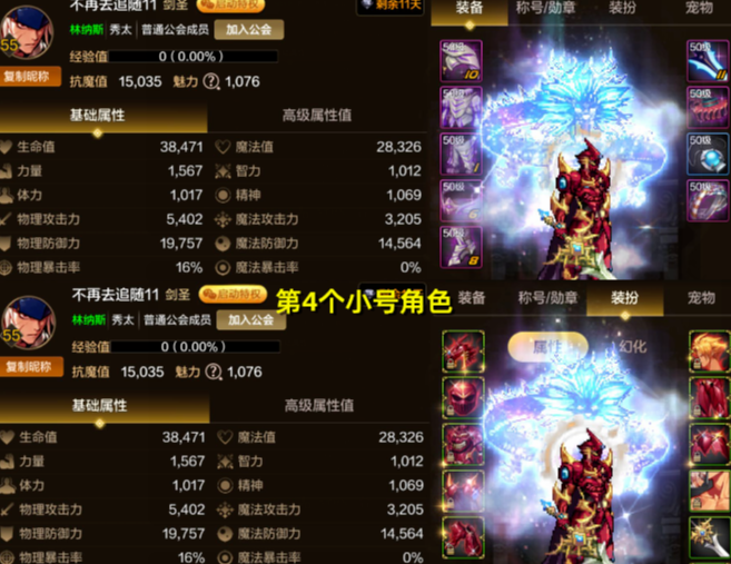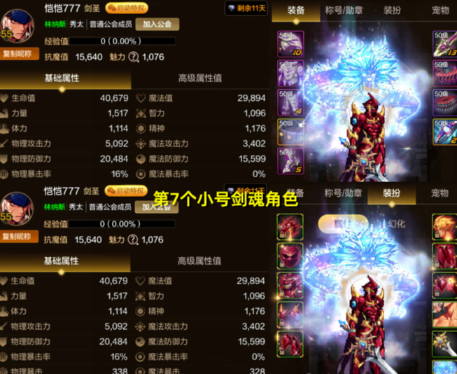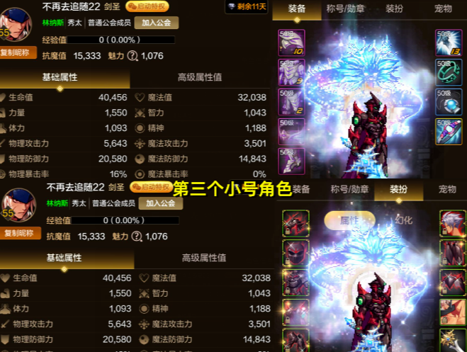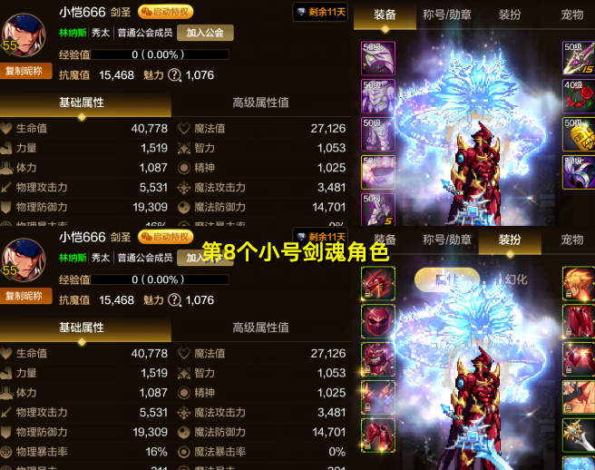 ②第二个小号剑魂,比第一个更差劲,抗魔才1.7万左右,强化非常低,首饰三件甚至都没强化!虽然装备不行,但也穿戴了纯色天1深渊骑士,金秋白金光环装扮;