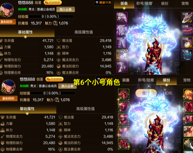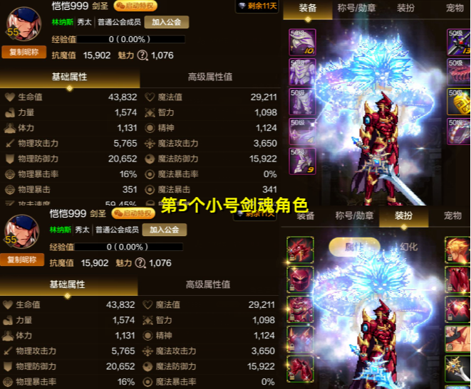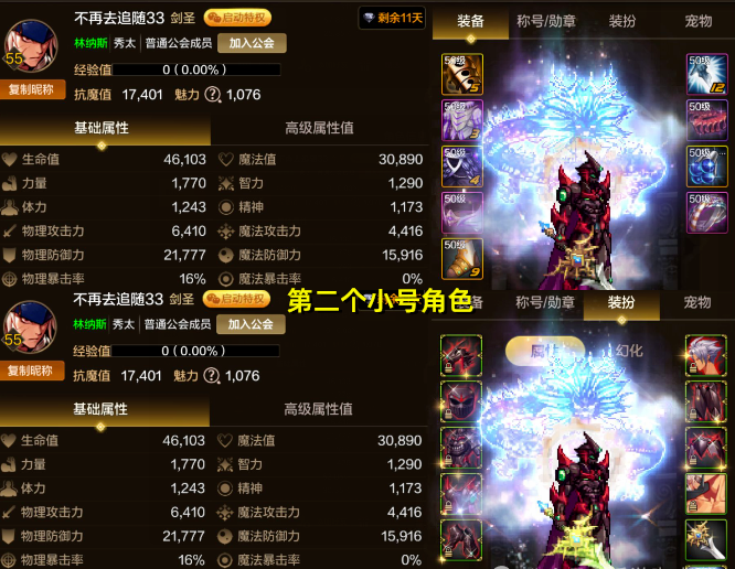 ⑤第五个剑魂小号,至少武器是50级史诗且强化至13,还能够拿得出手,也穿戴了纯色深渊骑士。