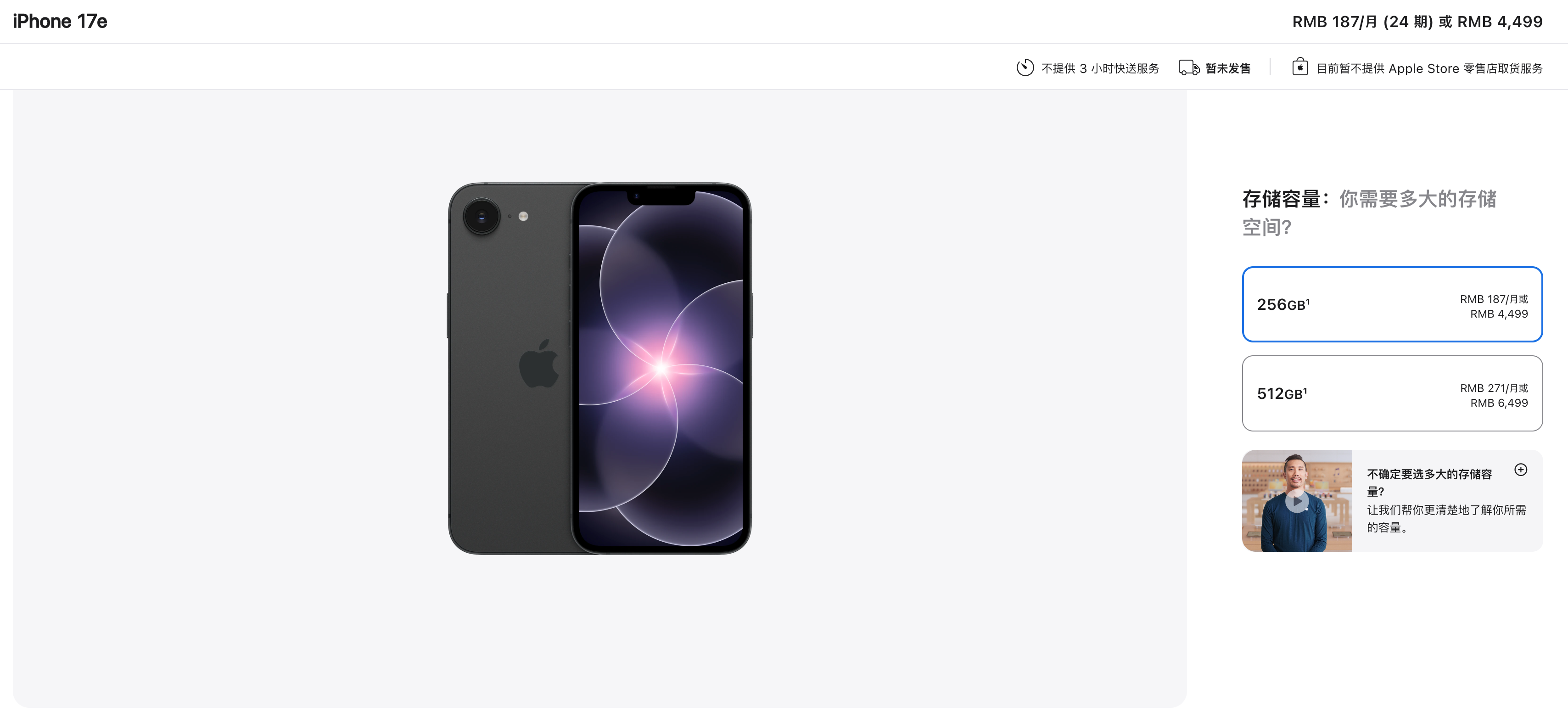 iPhone 17e提供256GB和512GB两个版本,售价分别为4499元和6499元。感兴趣的小伙伴可于3月4日晚去苹果官方渠道预购。