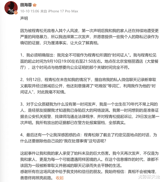 第二次是10月10日,田海蓉再次发声,提供了被程青松断章取义的完整版聊天记录,强调自己“完全不可能做程青松所谓的时间证人”,同时,她已报警并将证据留档。