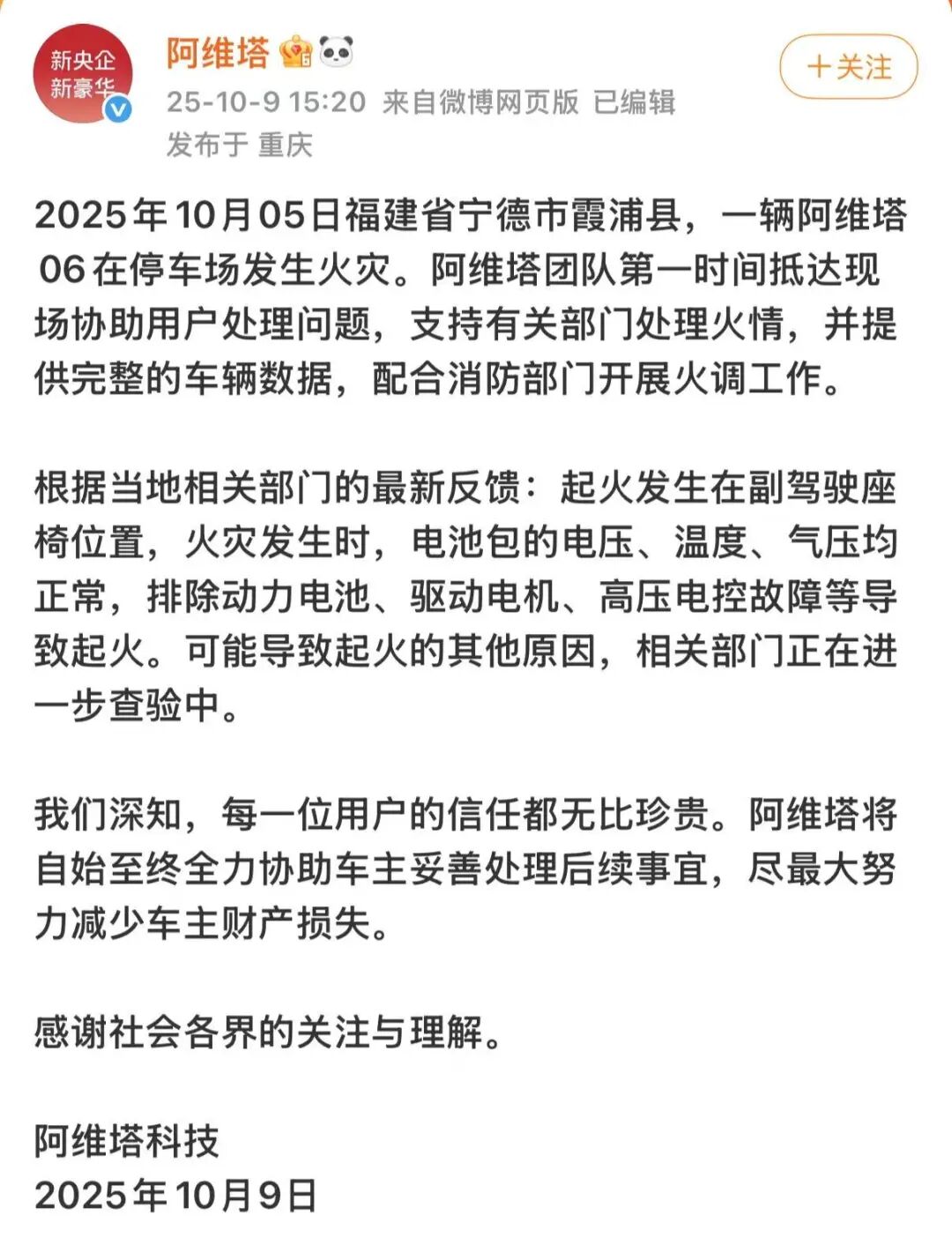 10月9日下午,阿维塔官方发布声明称:根据当地相关部门的最新反馈,起火发生在副驾驶座椅位置,火灾发生时,电池包的电压、温度、气压均正常,排除动力电池、驱动电机、高压电控故障等导致起火。可能导致起火的其他原因,相关部门正在进一步查验中。