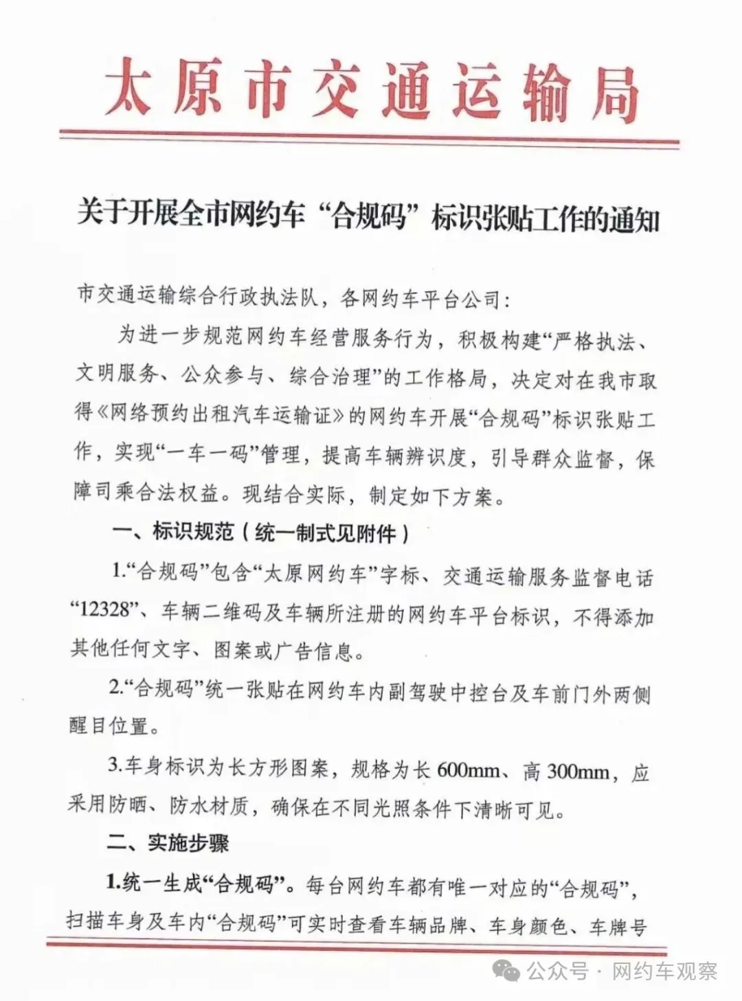 2025年12月31日,太原市交通运输发布通知,明确开展全市网约车“合规码”标识张贴工作,要求所有合规网约车统一贴上专属“合规码”,让市民监督更直观、出行更安心。