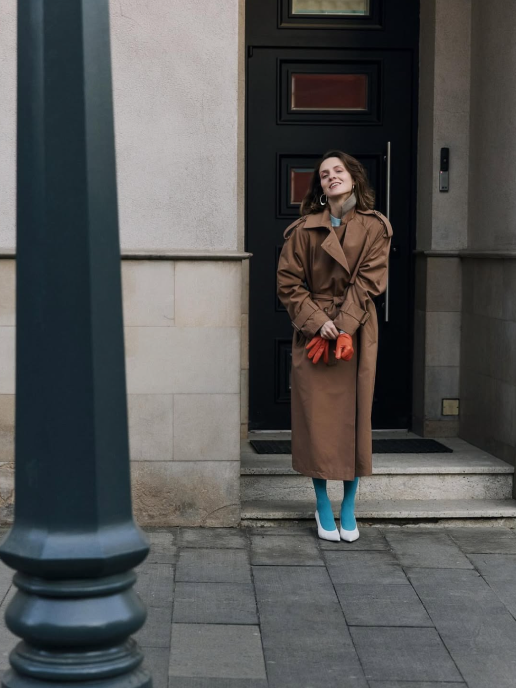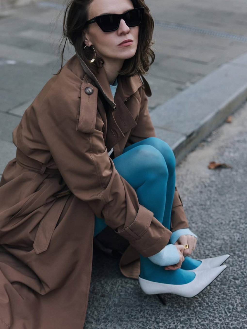 棕色长外套配蓝色针织衫和蓝色裤袜,这一抹幽蓝格外抢眼吸睛。