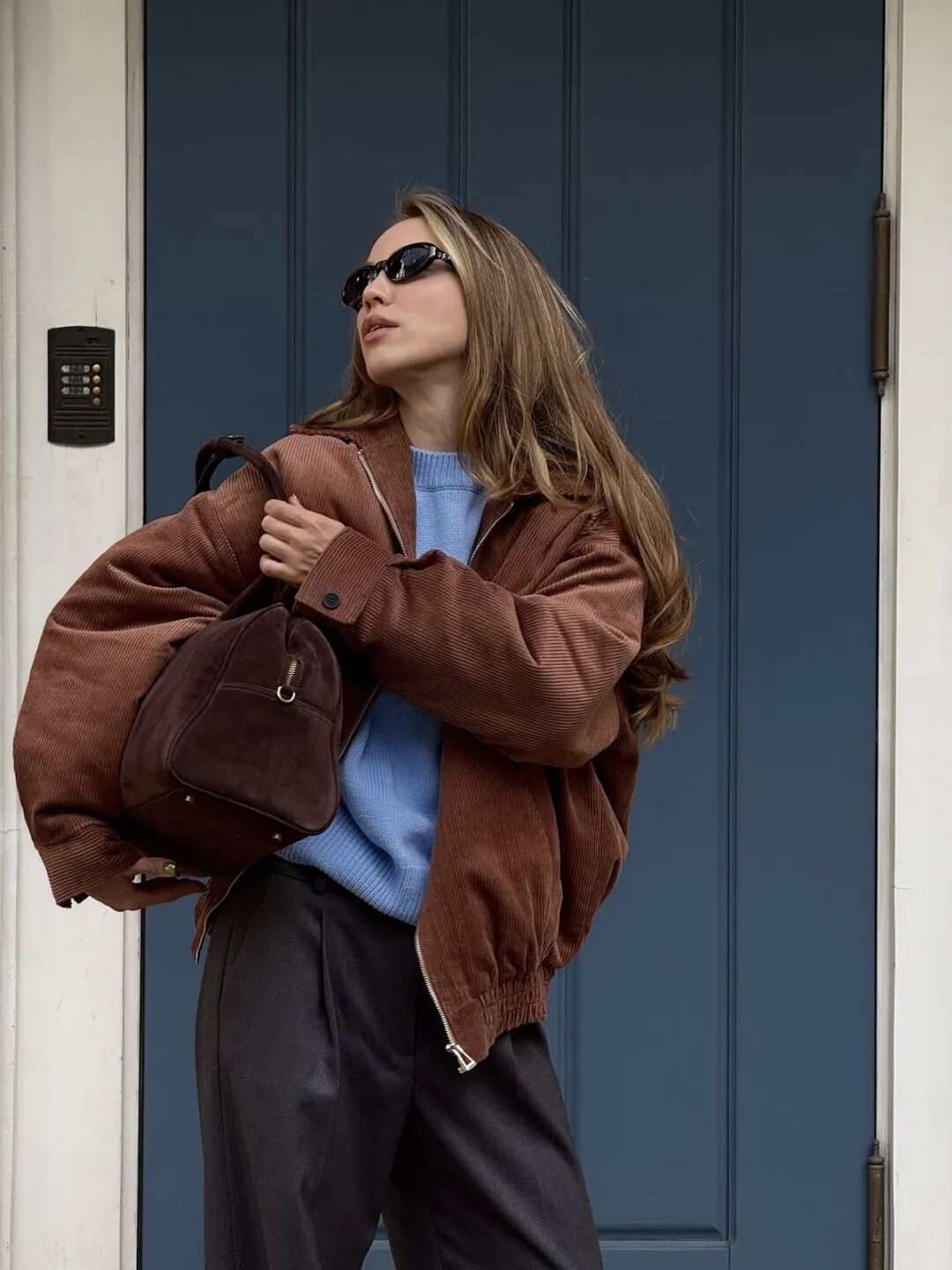 咖色的暖醇与蓝色的清爽,是冬日穿搭中极具呼吸感的组合。