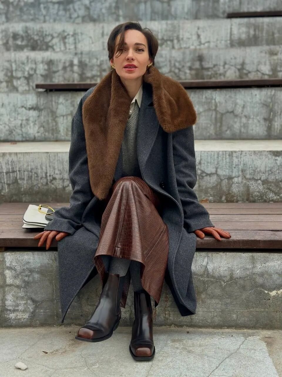 穿灰色大衣时,配一条棕色半裙,披一件皮草围巾,好看又显贵。