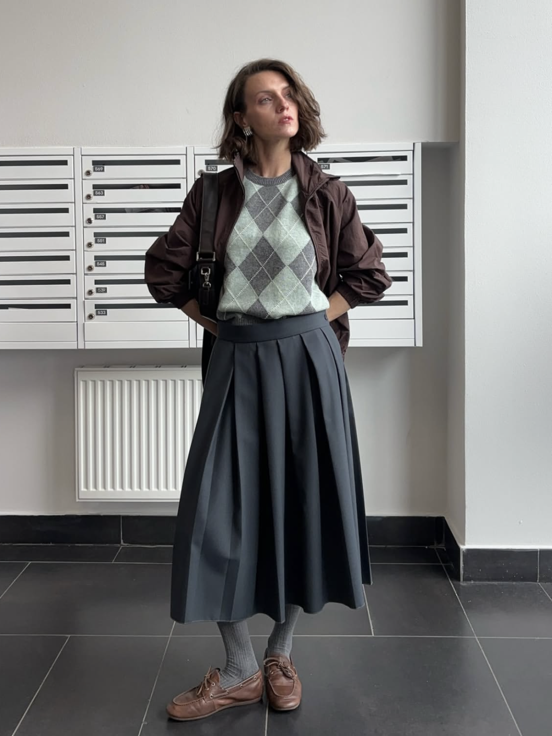想要休闲调调更浓郁一些,可以选择宽松的咖色夹克外套配灰色百褶半裙。