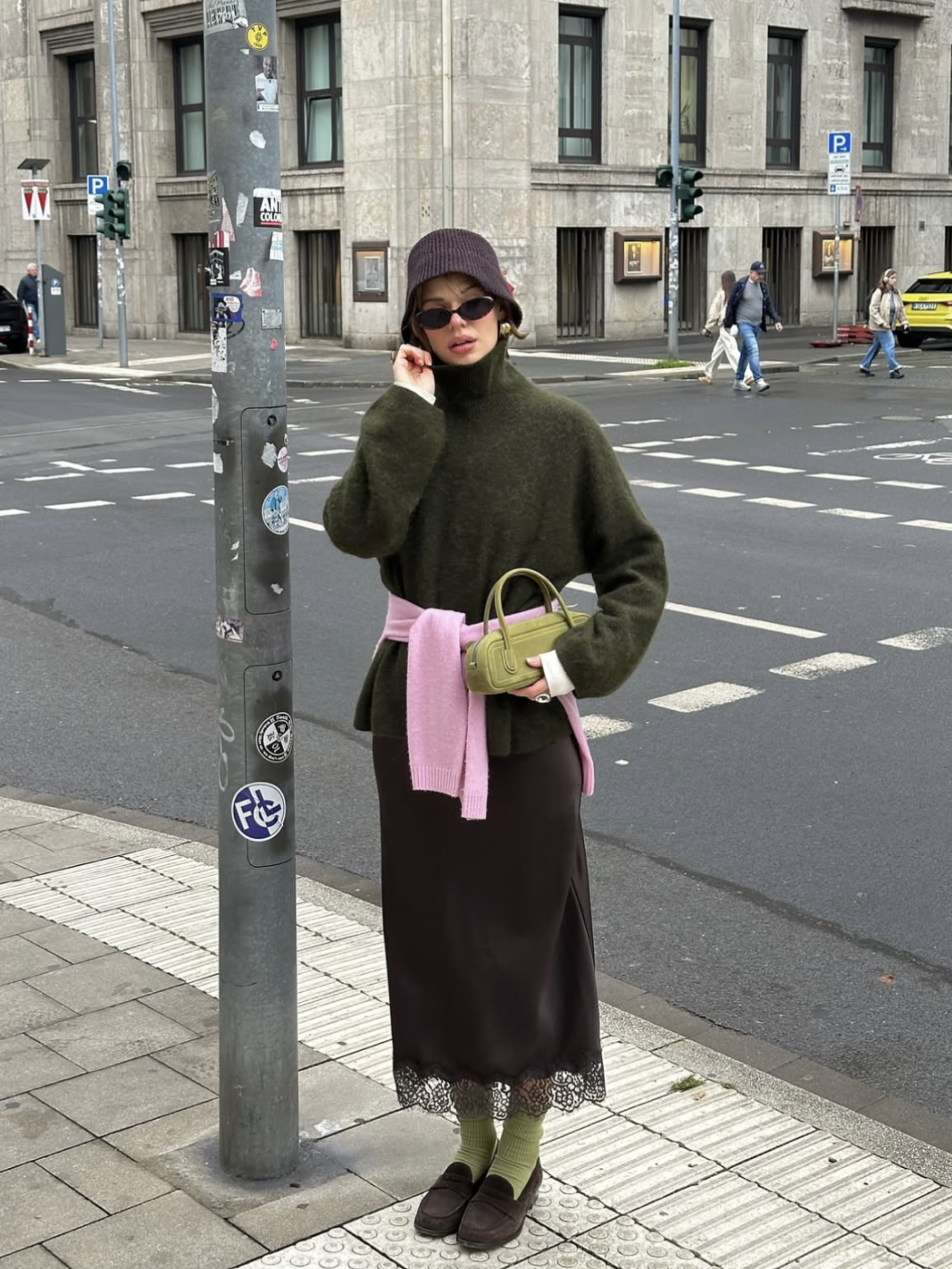 低调的墨绿毛衣搭配咖色半裙,缎面裙的细腻质感与羊毛的挺括形成对比,腰间一抹粉色点缀,再配芥末绿袜子、包包提亮点睛,好看时髦。
