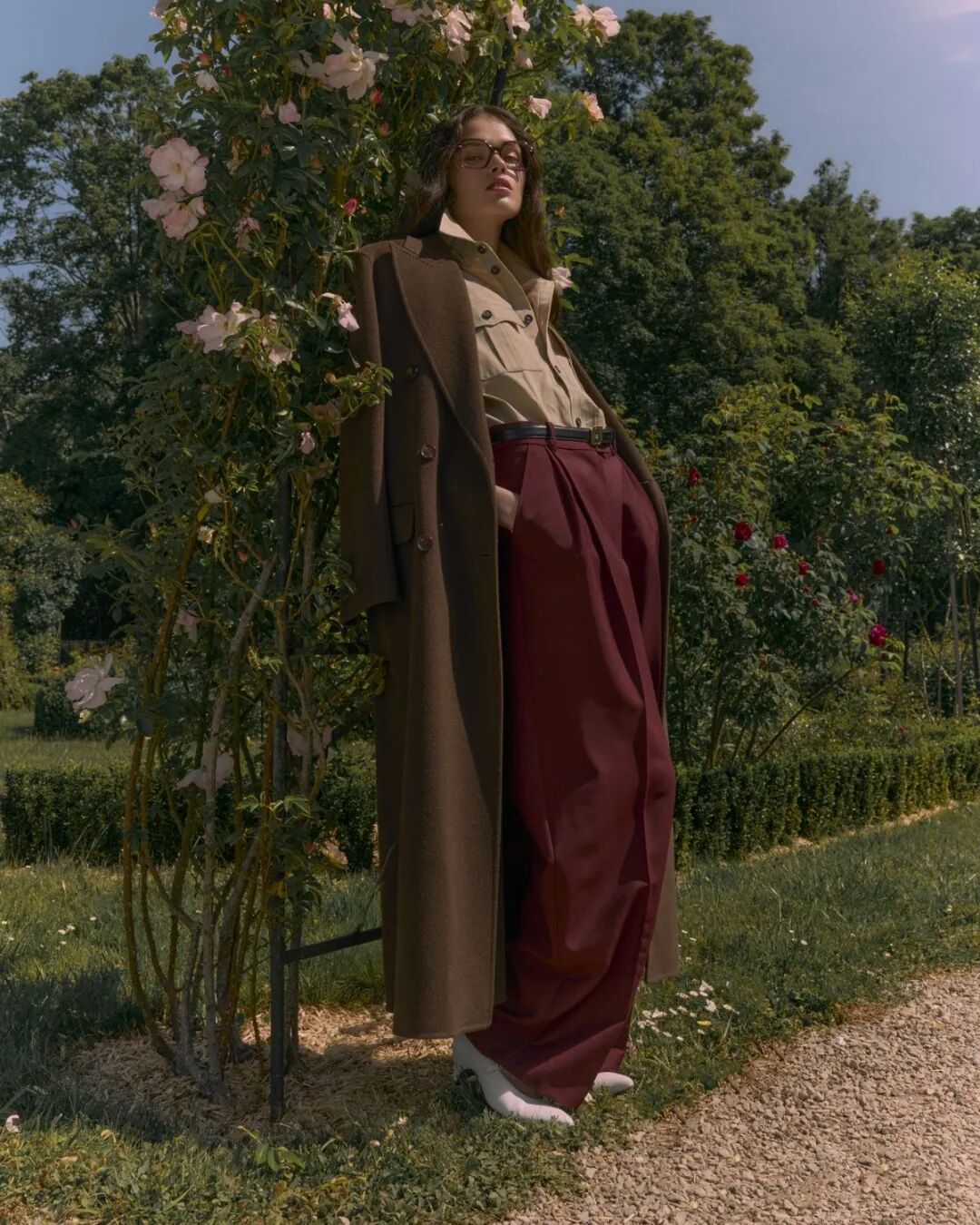 咖色羊绒大衣搭配米黄色毛衣,领口露出的一寸暖调,一丝清爽,为冬日增添了几分温柔,配一条咖色阔腿裤,宽松的版型包容所有身形,行走间衣摆轻扬,尽是从容。
