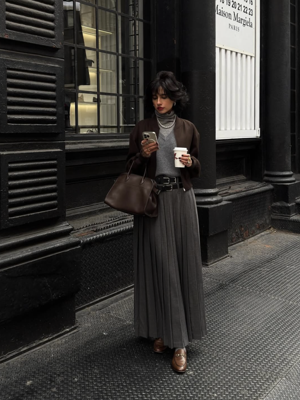 咖色短外套+灰色毛衣+灰色长半裙,拎一个咖色包包,穿一双咖色乐福鞋,这种高度克制又充满力量的风格,好看又干练。
