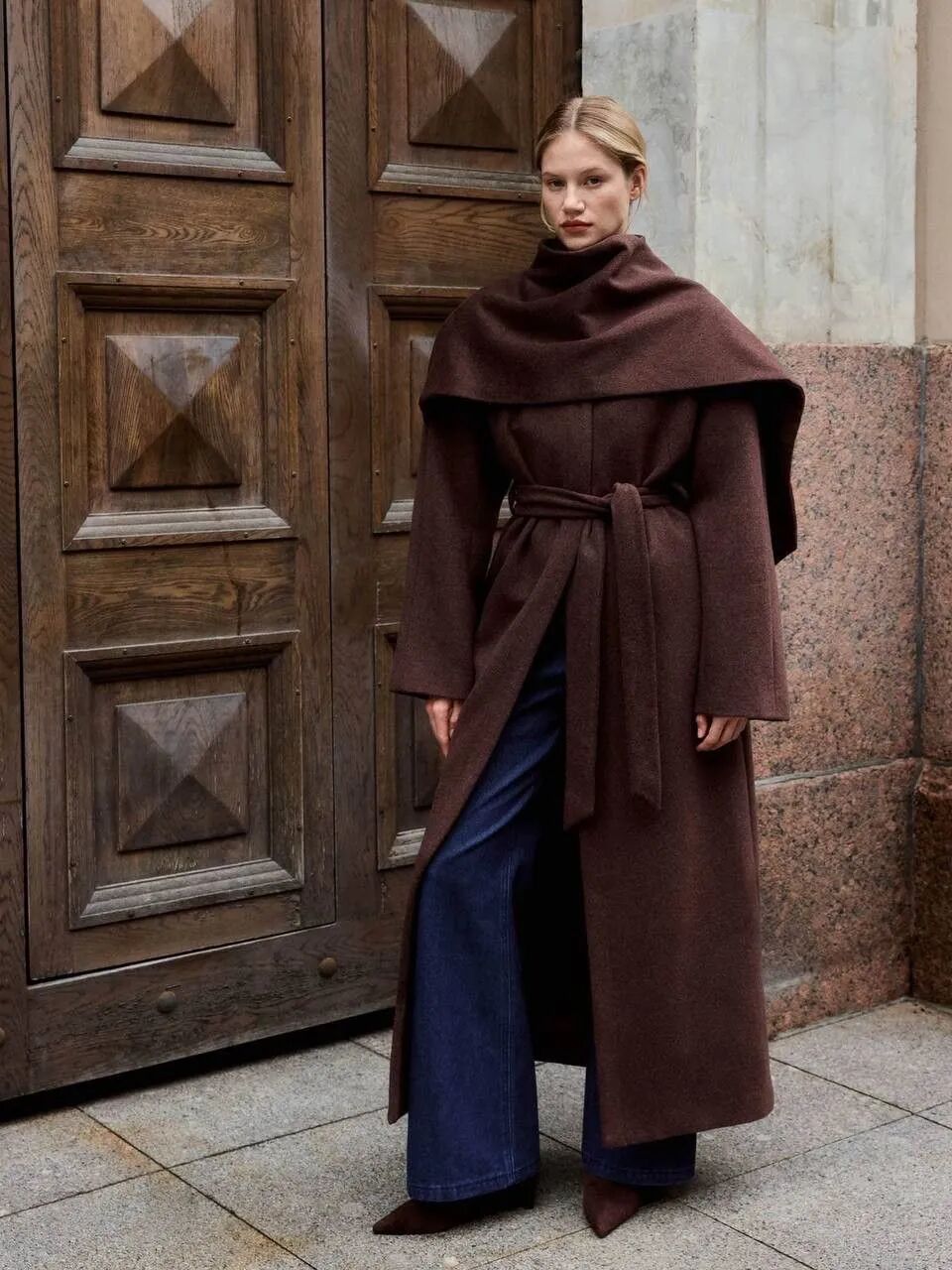 棕色大衣是绝佳的主单品,版型选利落的H型,既能撑起气场又不会显得臃肿,内搭红色毛衣+红色针织披肩,鲜亮的红避免大面积深暖调带来的压抑感。
