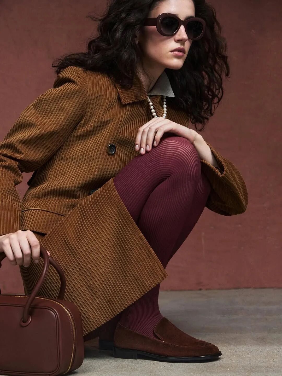 再以墨绿色配饰或同色系袜子衔接,让色彩层次像渐变的油画般自然过渡。