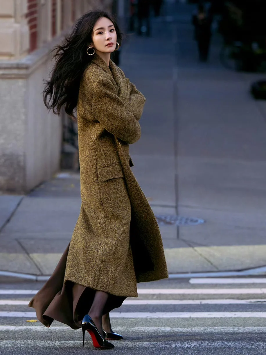 咖色外套搭配芥末绿毛衣,芥末绿像冬日里的一抹松针,鲜活却不张扬,打破了暖调穿搭的单调,又不会因撞色显得突兀。