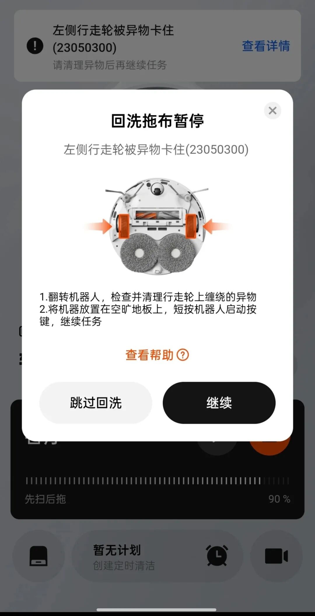 小唐向潘哥表示:“扫地机器人清洁完毕、返回基站时,显示行走轮被异物卡住,翻过来看根本没有异物,但系统始终报错。”