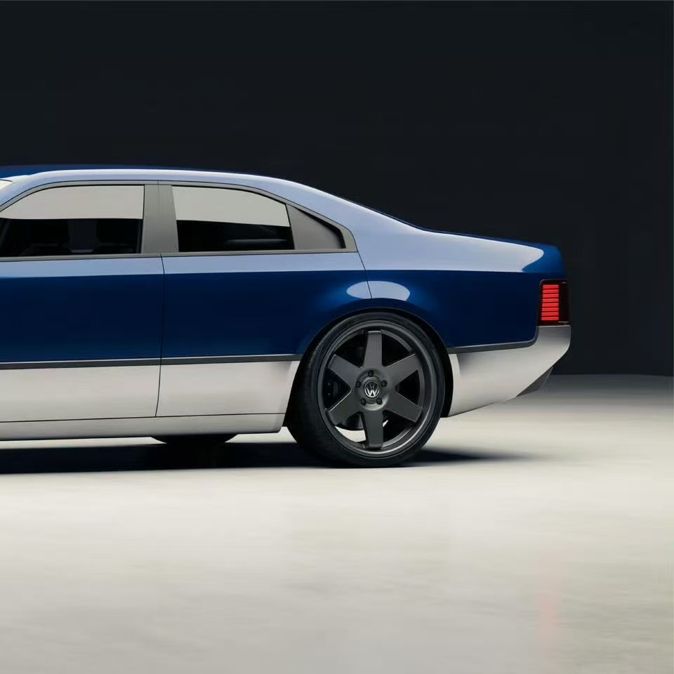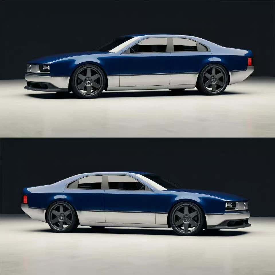 从vb的博主圈里看到这块大众桑塔纳复古概念车,蓝银双色的拼接,让整车复古感中透露出一种新潮,车身前脸造型采用的矩形前大灯组,搭载封闭式的前脸设计,底部好像加的熏黑的导流槽,侧面翼子板的造型让车头看着很有力量感。
