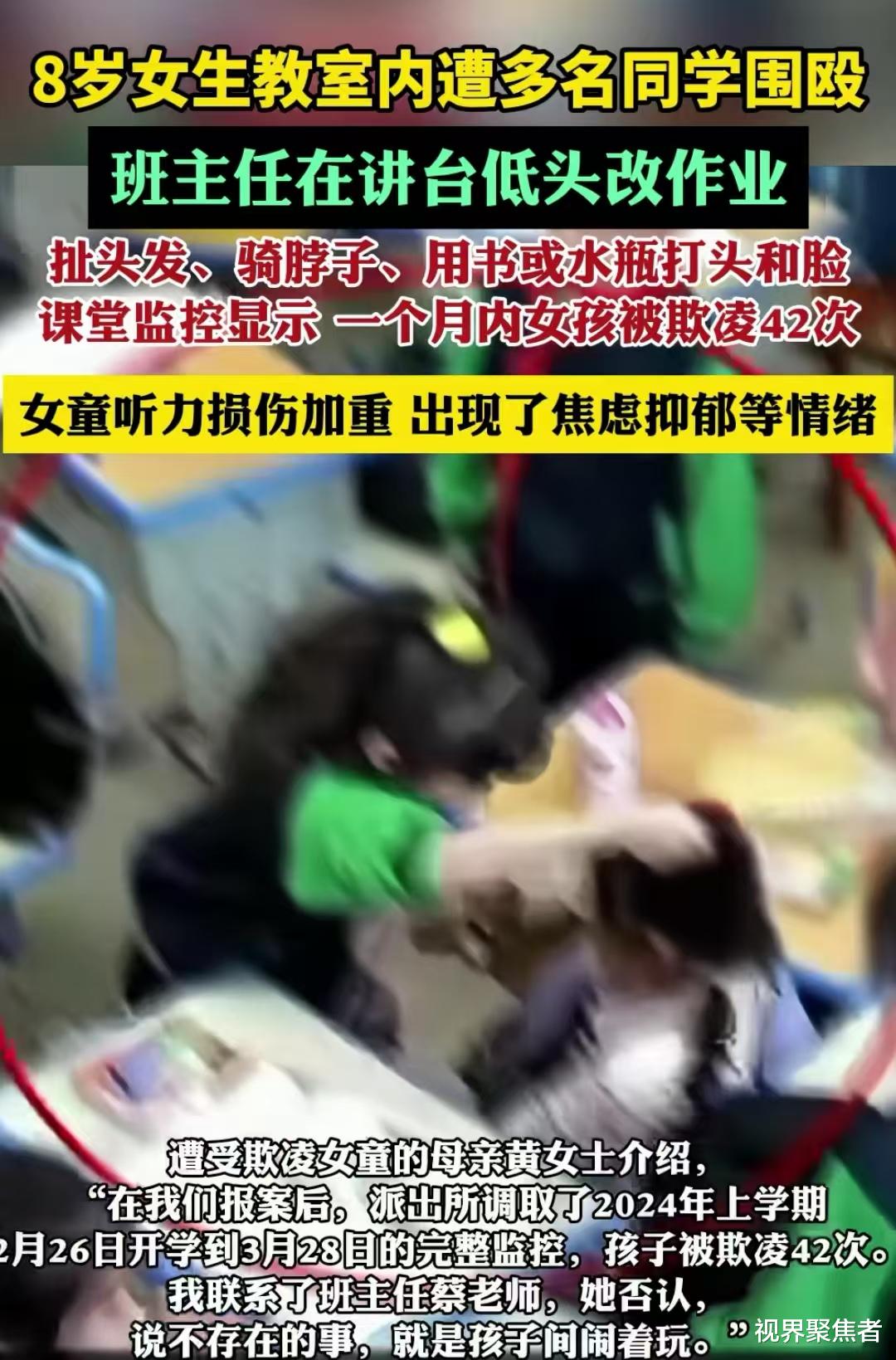 课堂监控如同一双无情的眼睛,清晰地记录下了一个月内女孩被欺凌42次的残酷画面。扯头发、骑脖子、用书或水瓶打头和脸,这些恶行如同恶魔的爪牙,一次次地伸向弱小的女孩。而我们的蔡老师,却仿佛置身事外,沉浸在自己的“作业世界”里,任由霸凌的风暴在教室里肆虐。