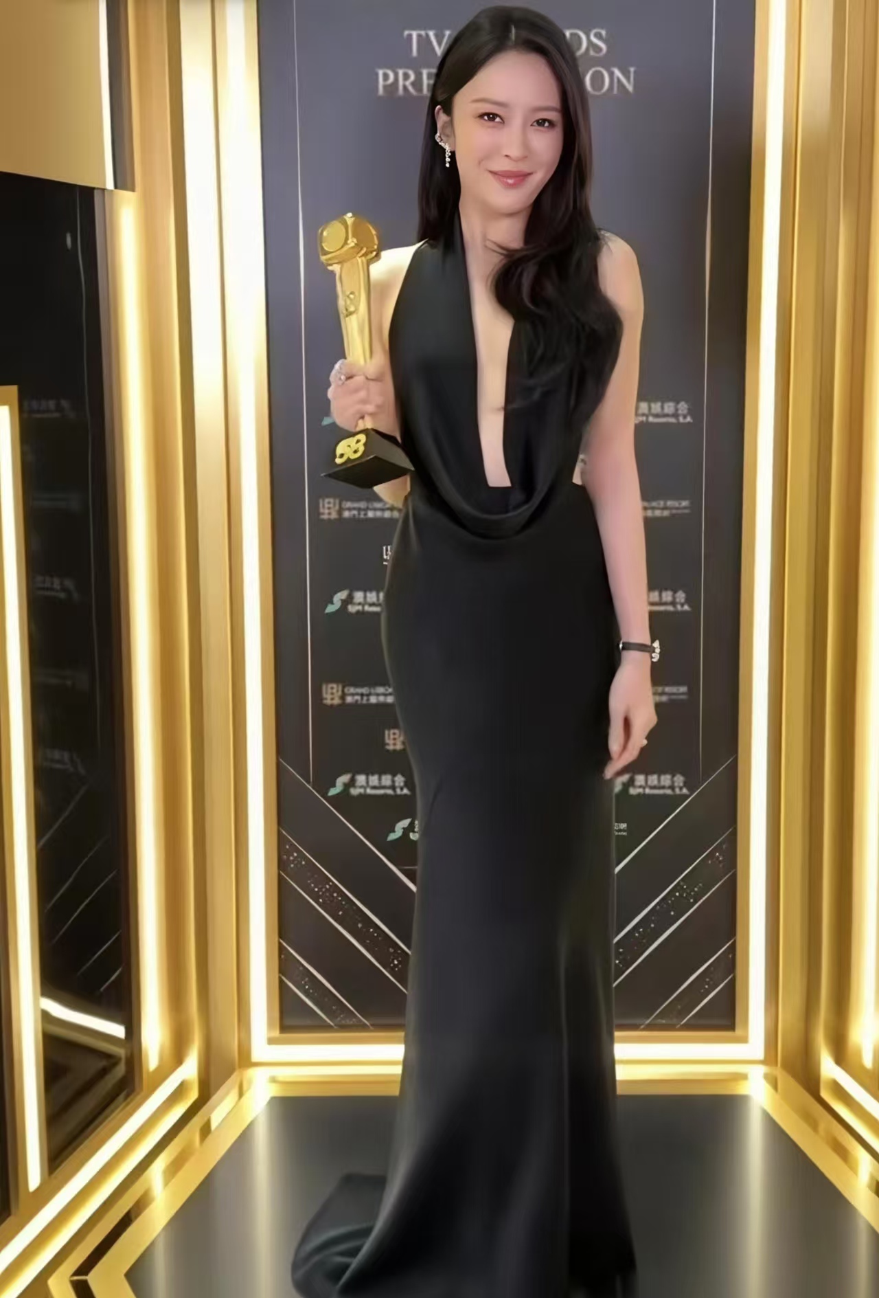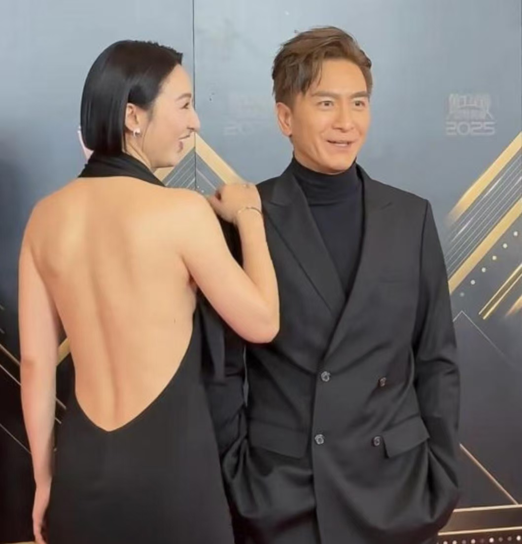 红毯上,女明星们的穿搭简直像约好了一样——黑色,开衩,露背,不是A就是V。高海宁那条黑裙,正面看平平无奇,转过身去,脊背几乎全裸,只靠一根细带撑着,配上1米72的身高和高跟鞋,站马国明旁边都快平视了。发型倒是有点迷,盘得太紧,愣是把原本的风情压出了一丝僵硬感。