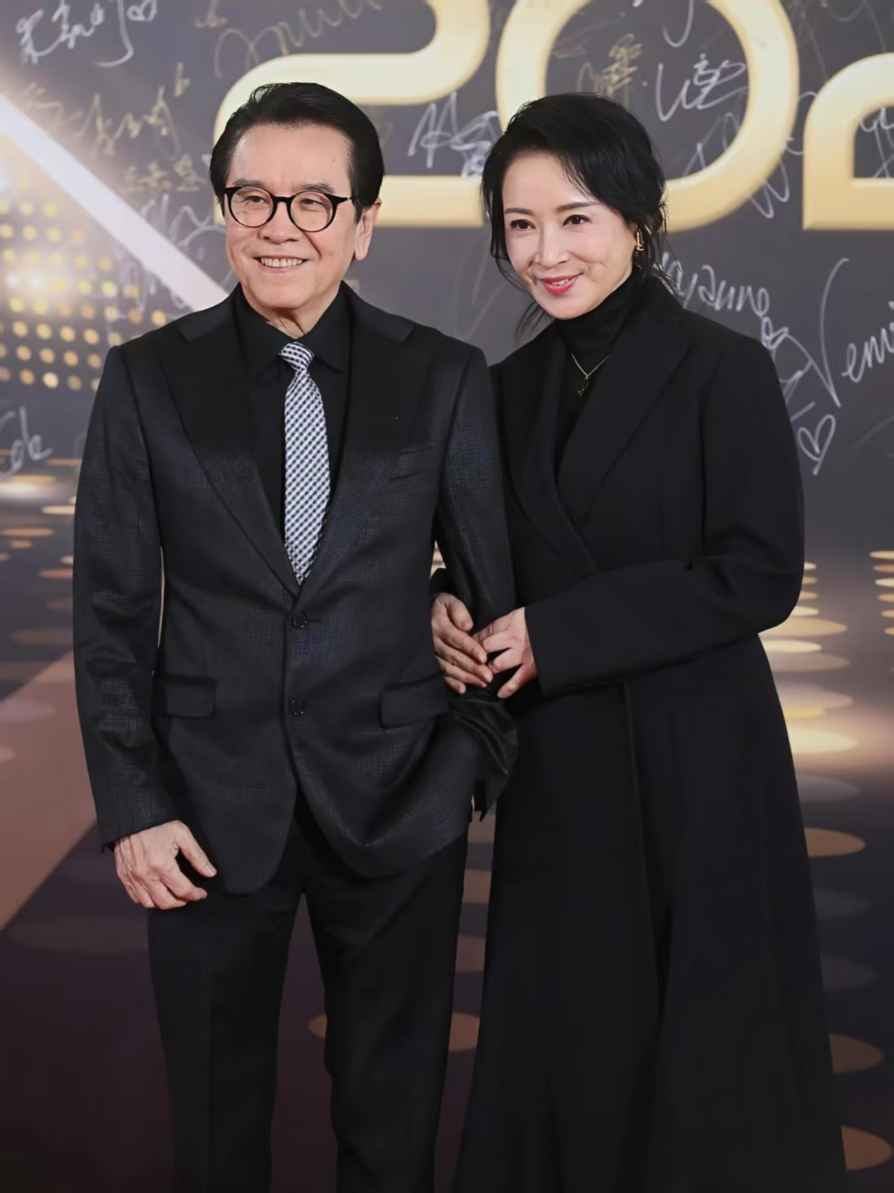 也有人反其道而行。龚慈恩一袭黑色长款大衣,高领毛衣裹得严实,头发利落挽起,跟78岁的姜大卫并肩出现,老夫老妻般自在。两人当年在《雪花神剑》里演的师徒恋,是多少人的青春记忆?现在再同框,脸上都有了岁月痕迹,可气场一点没弱。她跟粉丝合影,笑得亲切,一点架子没有,让人忍不住想,这才是真正的体面吧。
