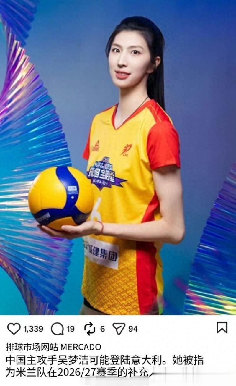 巴西十几万粉丝大V曝料:“中国主攻手吴梦洁可能登录意大利,她被指为米兰队在2026-2027赛季的补充人选。”企鹅体育知名主播转发了这条消息,并说明这是排球大博主发布的,可以做个参考吧!但是他觉得是大博主看到了欧洲个别小博主这几天消息,以及前一段时间的那次传闻,所以措辞是“可能”。具体到底出不出,还得再等近期土耳其和意大利的大博主发布吧。