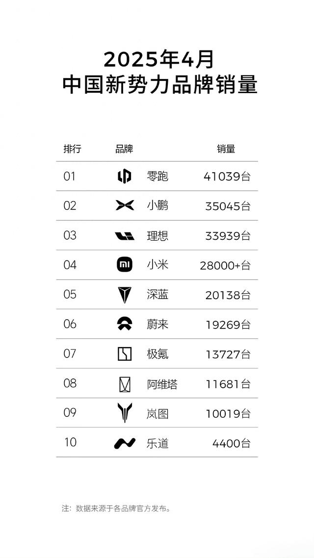 近日,某车企发布了一组4月份国产新势力车企销量排行榜,吸引了不少车友的关注。从此次发布的销量数据来看,4月份国产新势力车企的月销量成绩,很多都要高于3月份,尤其是跟去年同期相比,基本上都有大幅度提升。而在众多新势力车企中,大家熟知的零跑、小鹏、理想等车企,也都是再次稳居前列,成为当月最畅销的新势力车企之一。