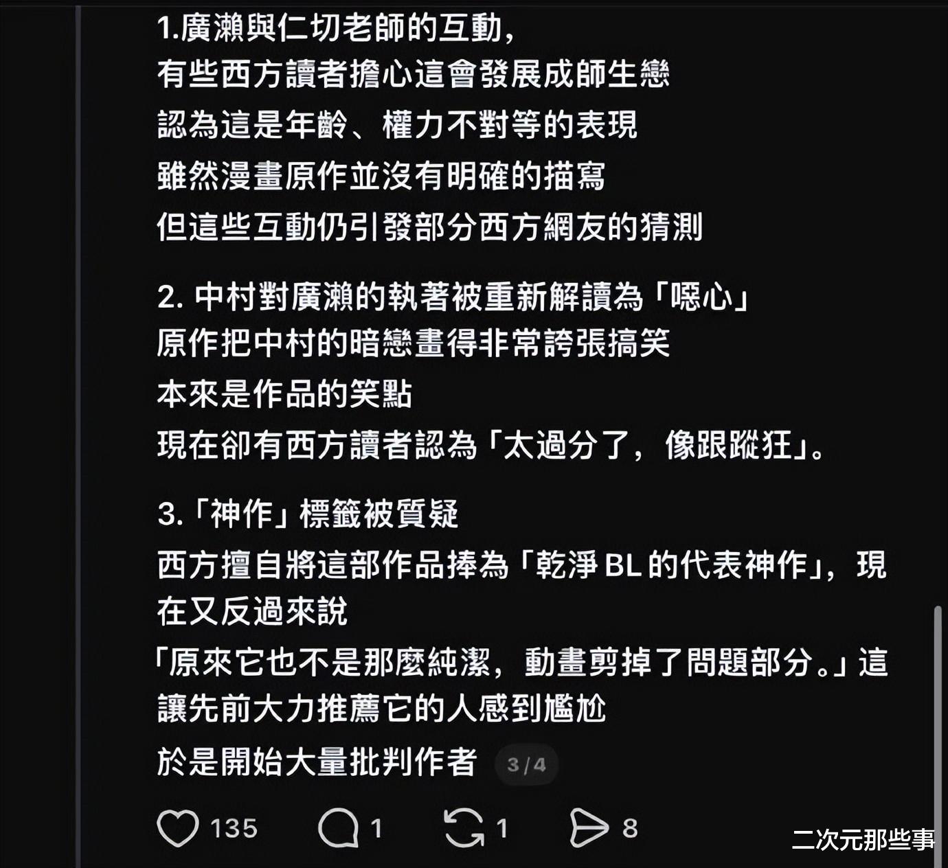 然后在欧美网友的显微镜观察下,《加油吧!中村君!!》漫画也被他们解读出了很多雷点,比如角色和老师互动,他们就认为这是“师生恋”,是年龄、权力不对等的表现,原作中主角的一些夸张行为原本是作品的笑点,但是在欧美观众的解读下就成了“太过分了,像跟踪狂”。