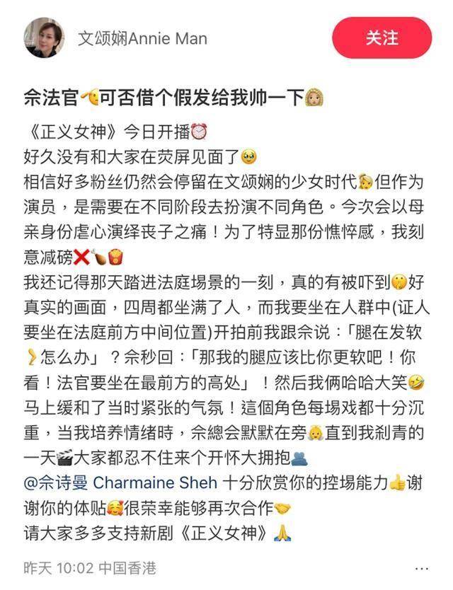 文颂娴说:当我培养情绪时,阿佘总会默默在旁。直到我杀青的一天,大家都忍不住来了个开怀大拥抱,@佘诗曼 Charmaine Sheh。十分欣赏你的控埸能力。谢谢你的体贴,很荣幸能够再次合作,请大家多多支持新剧《正义女神》。