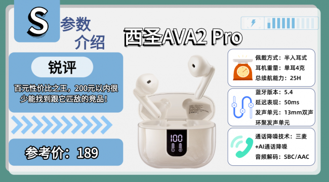 排行榜产品1、西圣AVA2 Pro蓝牙耳机——189元