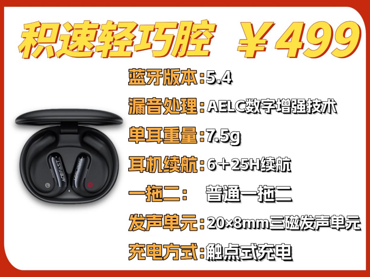 性能方面,它采用更稳定的触片式充电设计,改善了传统充电方式易出现的接触不良、连接中断等问题。针对开放式耳机常见的漏音问题,这款耳机设有专门的防漏音模式,在安静环境中使用时能有效降低对他人的影响。它支持双设备智能连接,切换过程顺畅便捷;搭配蓝牙5.4技术与四麦克风ENC降噪功能,通话清晰稳定。同时,它具备IPX6级防水能力,续航可达8+32小时,综合配置在同价位产品中竞争力强劲,性价比尤为突出。