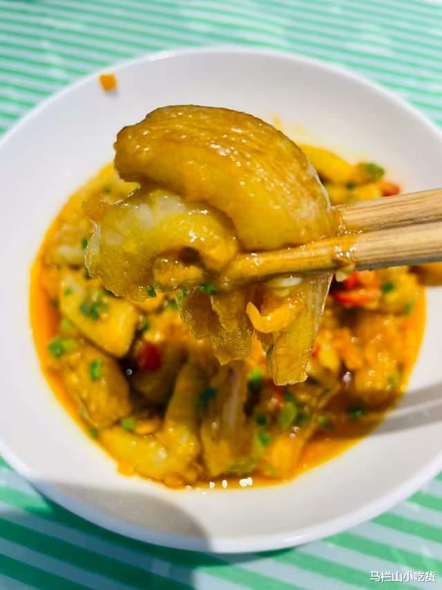 咸蛋黄茄子,新鲜咸蛋黄带着沙瓤,裹着切皮茄子一起出锅,吃起来绵密细腻。