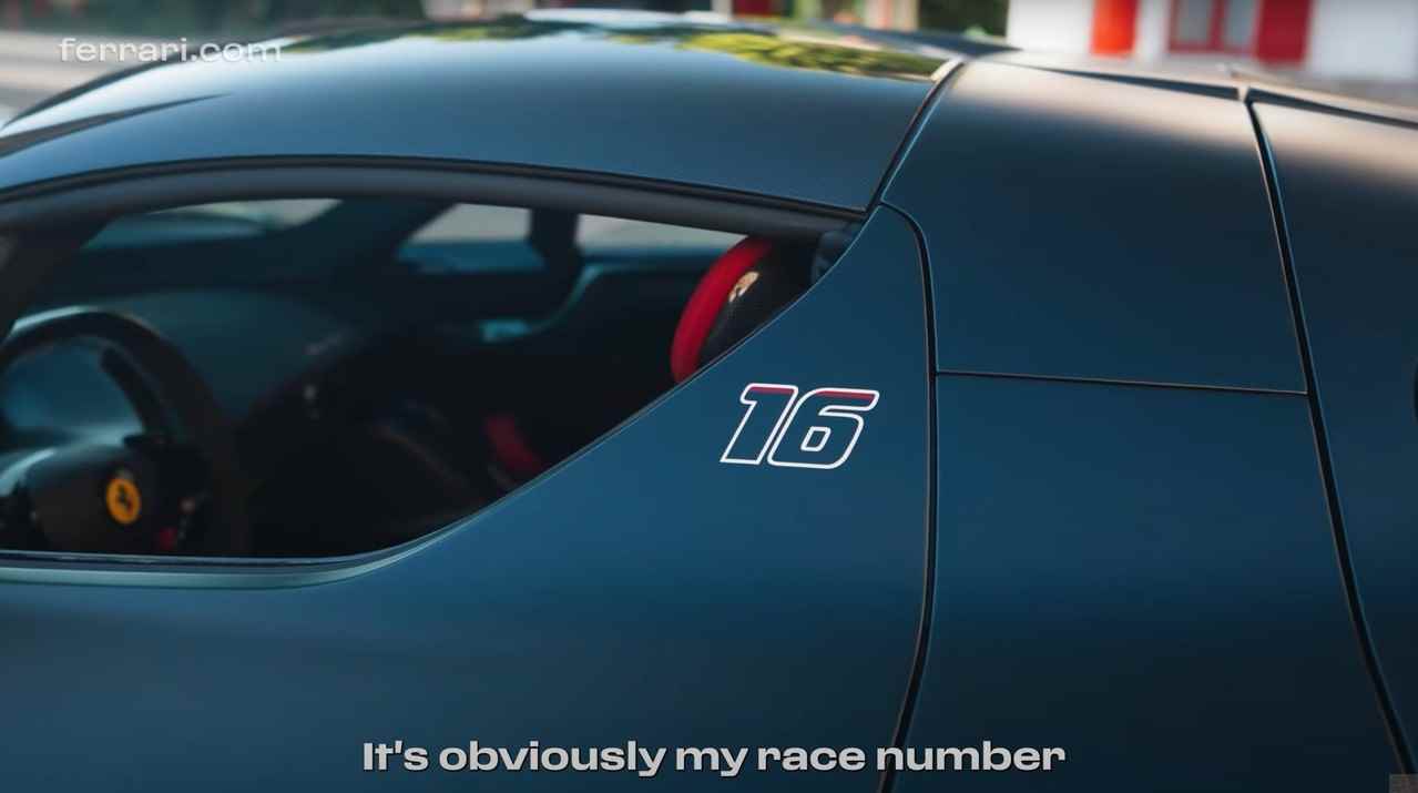 车上碳纤维部件饰有红色点缀,与黑色轮圈内的红色刹车卡钳相呼应。车门上绘有大型法拉利跃马标志,B柱上则刻有Leclerc的16号车手号码。
