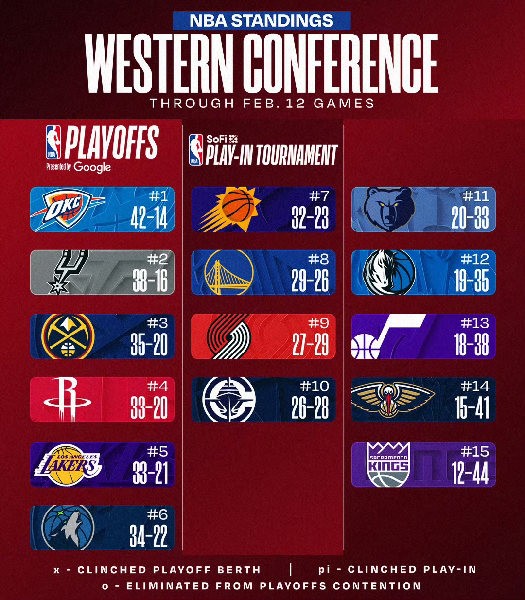 全明星周末来了,大伙儿正好歇口气,顺便看看西部这乱成一锅粥的排名。截止到2月13日,西部的格局已经清晰地分成了三个档次 。