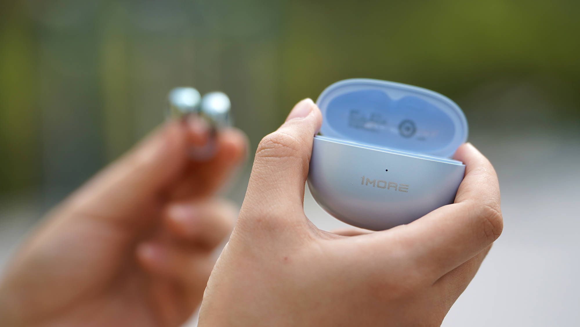 1MORE S20的充电舱的外形类似鹅卵石,又采用了微磨砂的表面工艺,握感非常舒适。耳机本体采用了镜面设计,这种设计有明显的外观优势——看起来精致,但是有一点小缺点——比较容易沾指纹,不过1MORE S20镜面程度很高,如果不是因为曲面的表面都能够当镜子用了,也正是因为这种高反光的表面,沾点指纹也不是那么明显,所以可以无感使用。