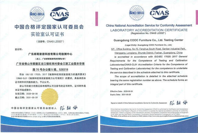 近日,库斯家居正式通过中国合格评定国家认可委员会(CNAS)的严格评审,成功获得CNAS实验室认可证书(注册号CNASL23327)。CNAS是经国家认证认可监督管理委员会(CNCA)授权的唯一国家级认可机构,代表中国签署国际互认协议(ILAC-MRA),其认可结果具有国际公信力。