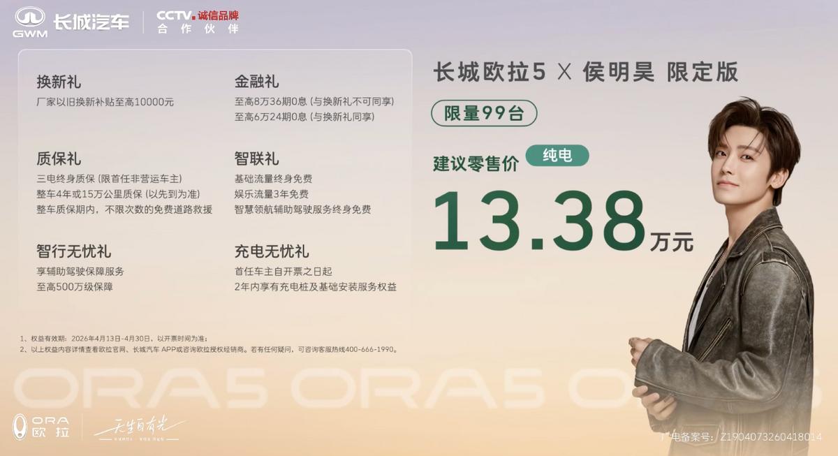 欧拉5侯明昊限定版基于用户共创打造,全国限量99台已全部售罄,此次交付的为纯电版,价格为13.38万元。