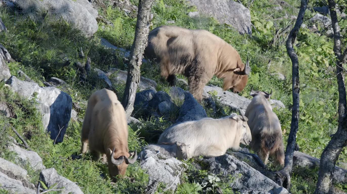 羚牛的长相很奇特,简单来说它们的脸像驼鹿,角似角马,背部肌肉隆起像棕熊,后肢较短似鬣狗,蹄子宽大如牛,尾巴则像山羊。因此,羚牛也就得了个“六不像”的外号。它们的食性跟山羊很相似,几乎是它们嘴能够到的植物,都会被吃进肚子里。据研究统计,羚牛能够取食的植物甚至多达300种。