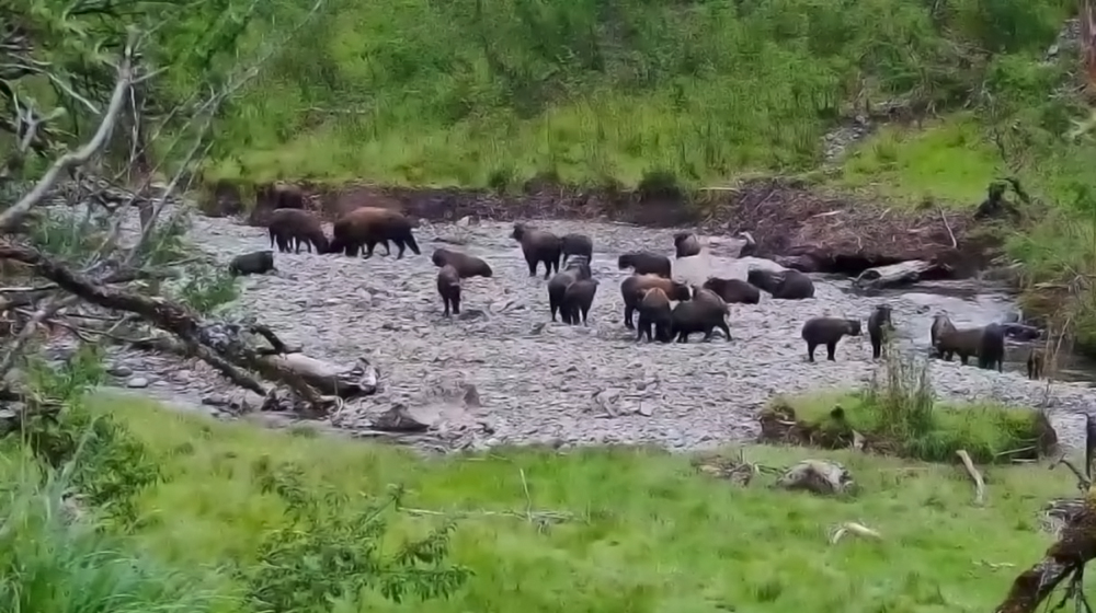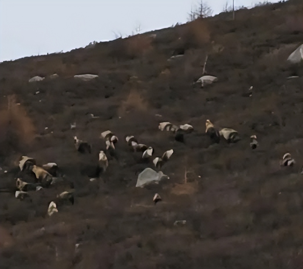 它们的数量多达30多头,聚集在一处山沟上,有的嬉闹玩耍,有的低头觅食,还有的站在高处警戒瞭望。这一羚牛群的成员多数是成年羚牛,它们体态健壮,肌肉明显。其中还有8头体型明显较小,看样子是羚牛幼崽无疑了。