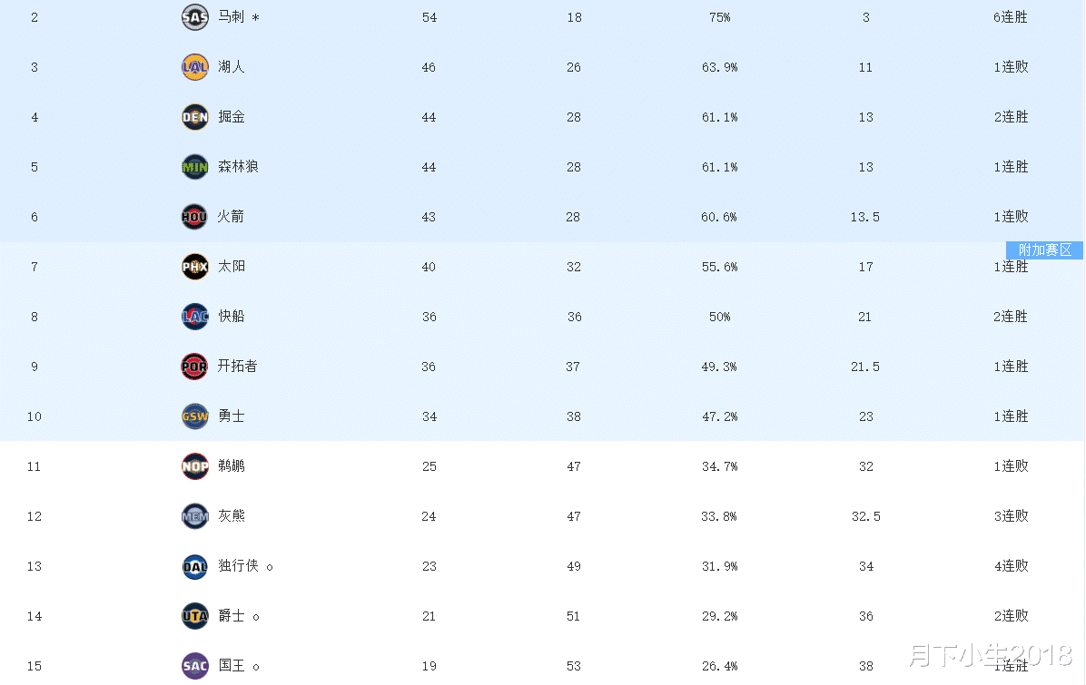 西部这边截止到今天排在第十的勇士队领先第十一的鹈鹕多达9个胜场,基本上已经锁定了附加赛资格。勇士队自从头号球星库里在赛季中期受伤之后,已经连续缺席二十二场比赛,而勇士队在缺阵的情况下仅取得7胜15负的战绩,但他们丝毫不慌,他们依旧以34胜38负稳稳排在西部第十,赛季末如果库里能够及时回归,他们能够向西部第八的名次发起冲击。