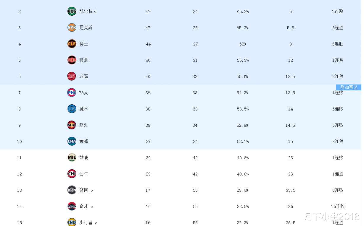 而在东部,季后赛和附加赛席位也基本上是板上钉钉的事情了,东部第十的黄蜂队领先第十一的雄鹿队8个胜场,附加赛资格无忧。本赛季字母哥因为伤病原因缺席多场比赛,雄鹿队也早早放弃本赛季的争夺。