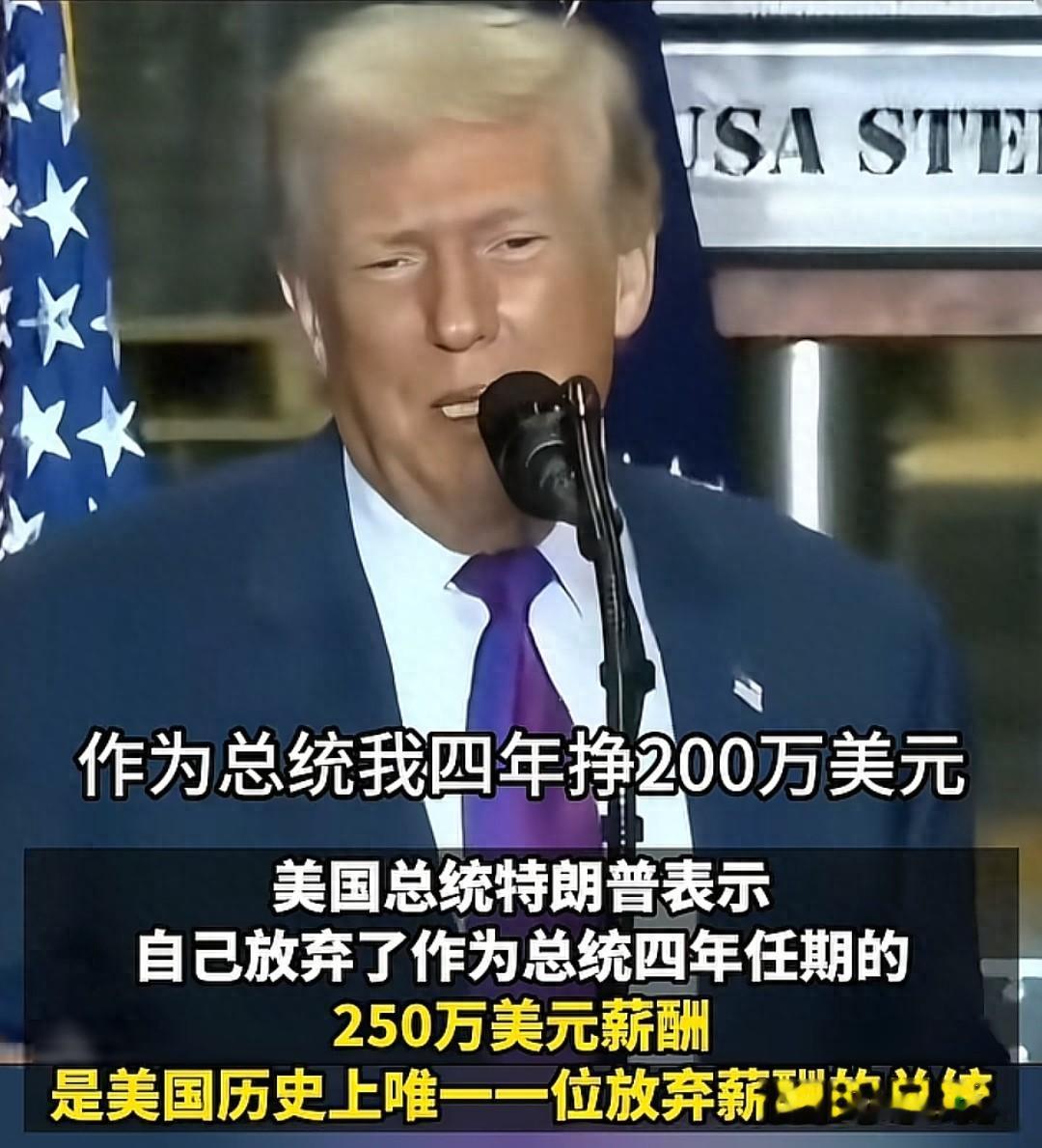 川普在演讲上自嘲自己放弃了四年的总统工资,约250万美元,这在美国历史上没有一位总统这样做的,我就是唯一的笨蛋,没有捞到任何的好处